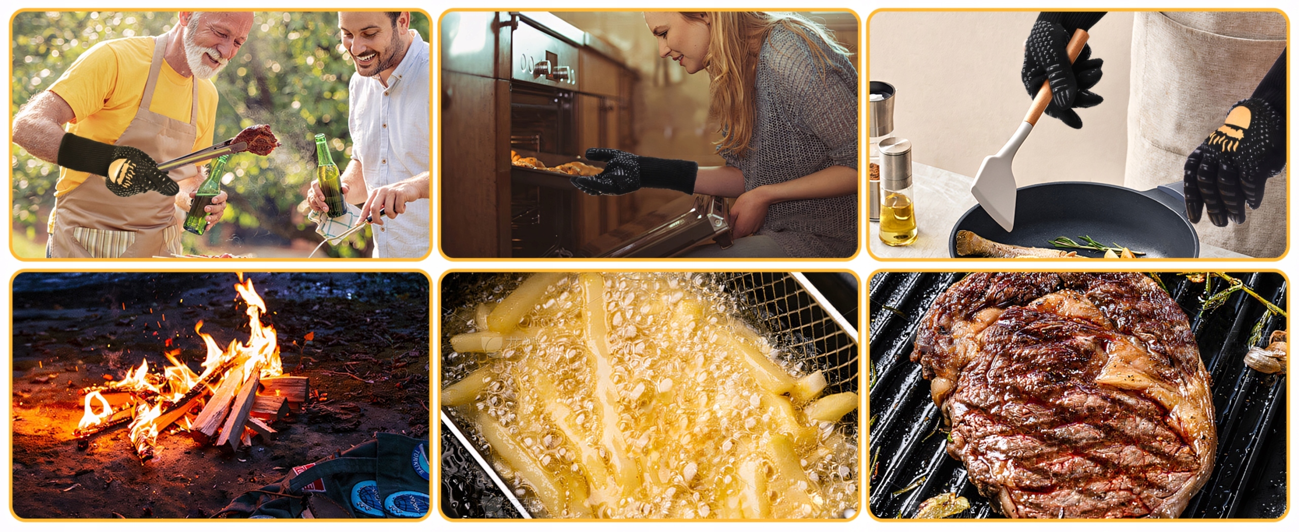 рукавички виготовлені з високостійким арамідним волокном , що витримує температуру до 800 ° C . Ідеально підходить для гриль, духовки, багаття, каміна та кухні .