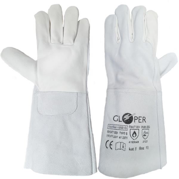 Gloper - робочі рукавички для зварювання. Виріб виготовлено з двох видів шкіри: внутрішня сторона руки - з високоякісної зернистої козячої шкіри, а зовнішня - з високоякісного спилка. Вказівний палець повністю виготовлений із натуральної шкіри. Рукавички призначені для всіх видів зварювальних робіт. передпліччя, захищаючи таким чином від розм’якшення та захищаючи зап’ястя від травм.