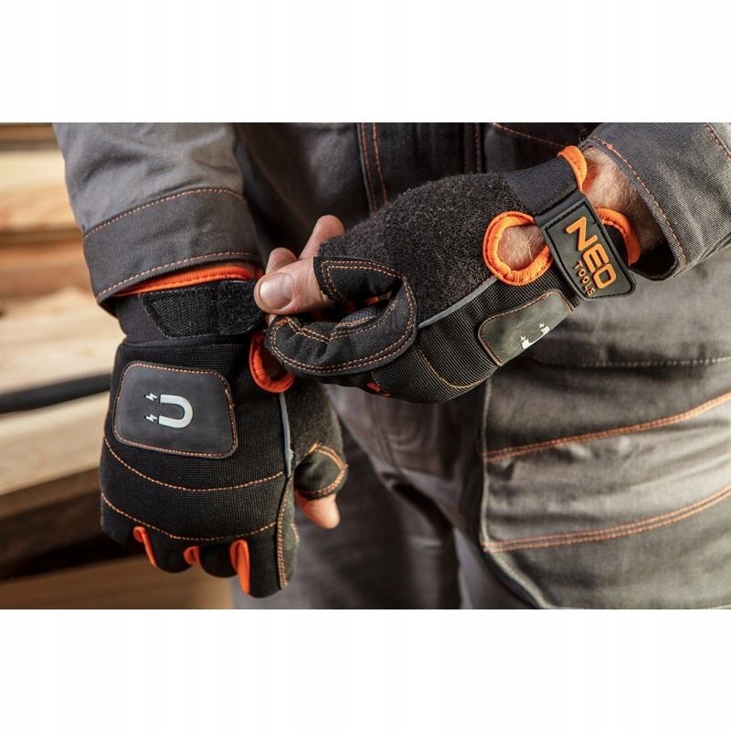 робочі рукавички з магнітом, без пальців, розміром 10 "neo (посилання gd014) мають магніт на спині, завдяки якому в самому стані він має гвинти, гайки та інші невеликі елементи під час роботи. Три оголені кінчики пальців на липурі на зап'ясті дозволяють регулювати окружність, що відповідає умовам для en 388.