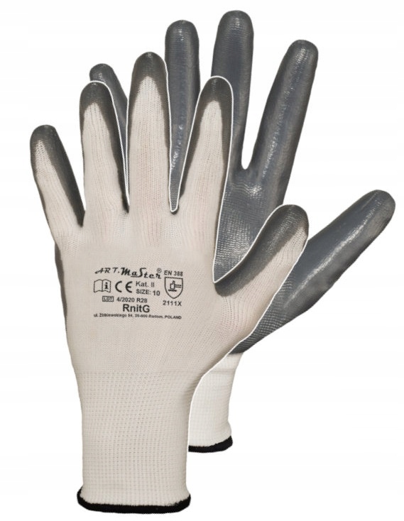 Захисні рукавички, виготовлені з дихаючої поліефірної тканини білого кольору, покриті нітрилом сірого кольору. Рукавички виготовлені за безшовною технологією, додатково оброблені рантом. Нітрилове покриття підвищує стійкість до мастильних матеріалів і олив і зменшує проникнення бруду . Міцний, гнучкий, стійкий до стирання та розривів. Вони ідеально лягають на руку, забезпечуючи чудову спритність і надійне захоплення інструментів.