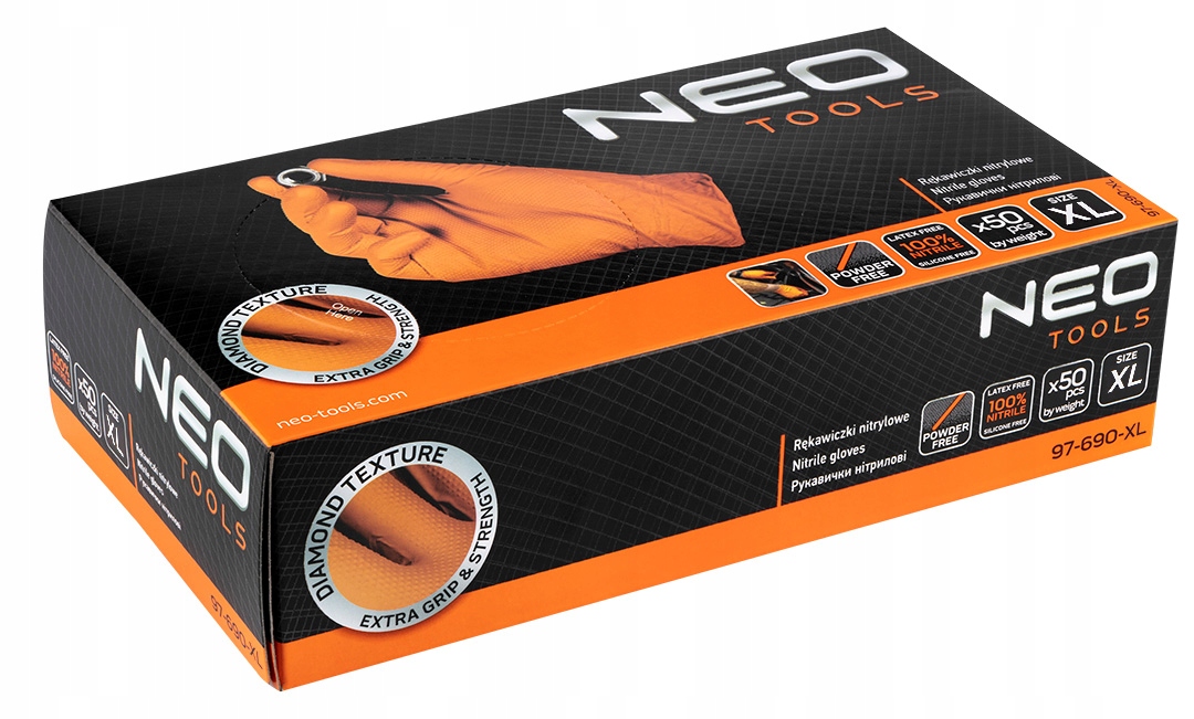 Перфоровані нітрилові рукавички, помаранчеві, 50 шт., розмір XL, 97-690-XL від NEO - це рукавички з міцнішого матеріалу, ніж звичайний нітрил, щоб забезпечити більшу стійкість до проколів або розривів у складних умовах.