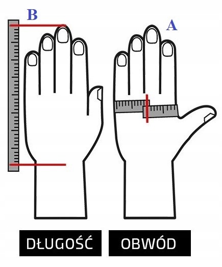 Виміряйте довжину середнього пальця (розмір A) та ручної схеми (розмір B). Рукавички доступні у розмірах: