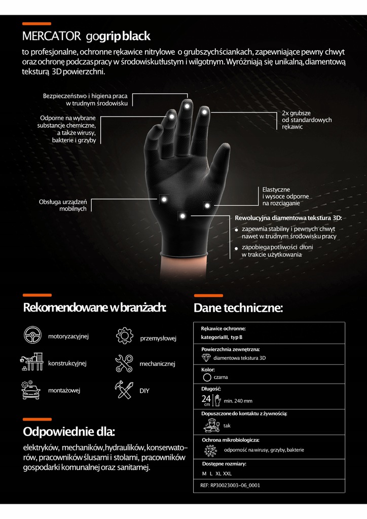 - Зовнішні та внутрішні виступи мінімізують ковзання та зменшують втому рук, що особливо важливо під час механічної роботи та необхідності міцного захоплення у вологому чи масляному робочому середовищі.