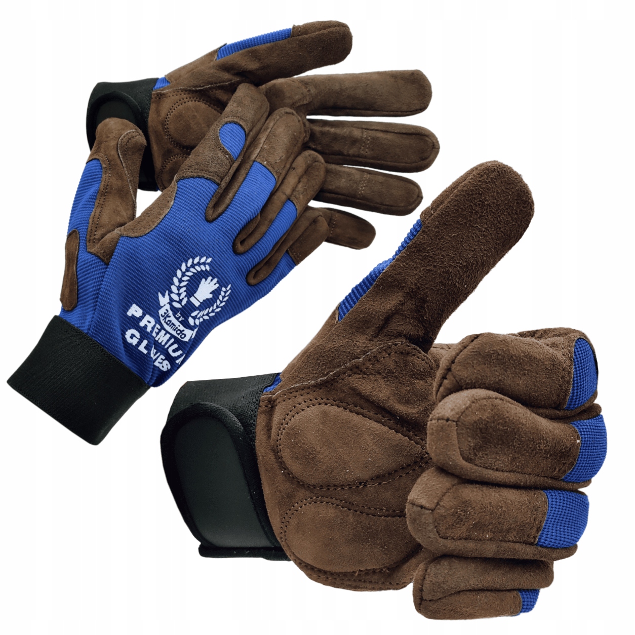 РУКАВИЧКИ PREMIUM/ 3KAMIDO. Робочі рукавички, посилені шкірою, професійний захист рук від травм і пошкоджень, таких як садна, порізи, розриви. Рукавички ідеально підходять для робіт, що вимагають хорошого зчеплення та спритності. Колір: синій + коричневий. Розміри: 6, 7, 8, 9, 10, 11. Матеріал: гнучкий поліестер/шкіра з внутрішньої сторони та пальців. Конструкція: модель з п'ятьма пальцями, хребет з еластичного поліестерового трикотажу, внутрішня частина і кінчики пальців укріплені шкірою у внутрішній частині руки, амортизаційні подушки, вентиляція збоку від пальців (отвори), що підвищує комфорт використання, регульована ширина манжети за допомогою липучок, що забезпечує ідеальну посадку. Застосування:механіка, транспорт, перевантаження, будівництво, садівництво та городництво, лісове господарство, сільськогосподарські роботи, роботи з прибирання.