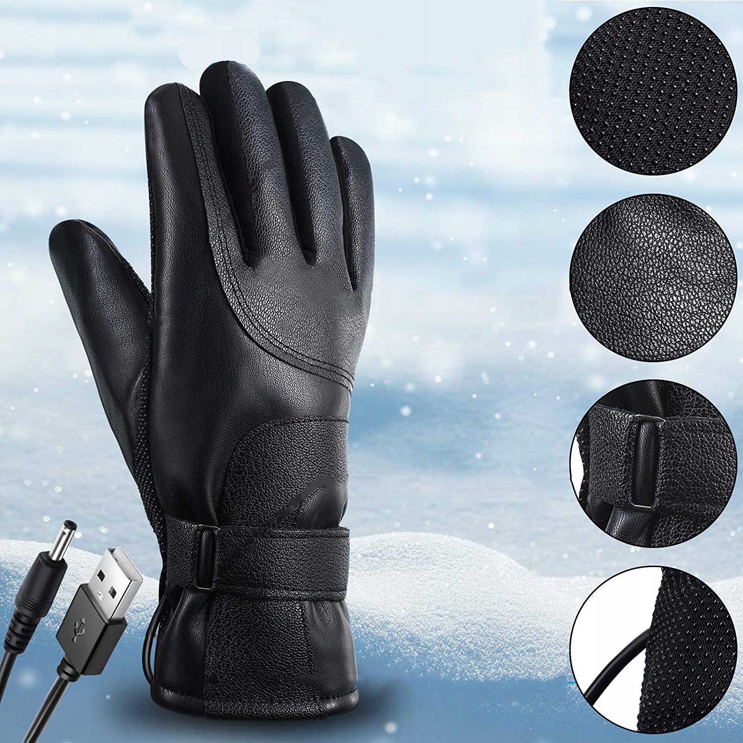 До вказівного та великого пальців рукавичок із підігрівом пришито спеціальний шкіряний матеріал. Ви можете користуватися інтелектуальними електронними пристроями, такими як мобільні телефони та планшети, не знімаючи нагрівальних рукавичок. Манжета застібається регульованим шнурком, який можна відрегулювати відповідно до ваших потреб.