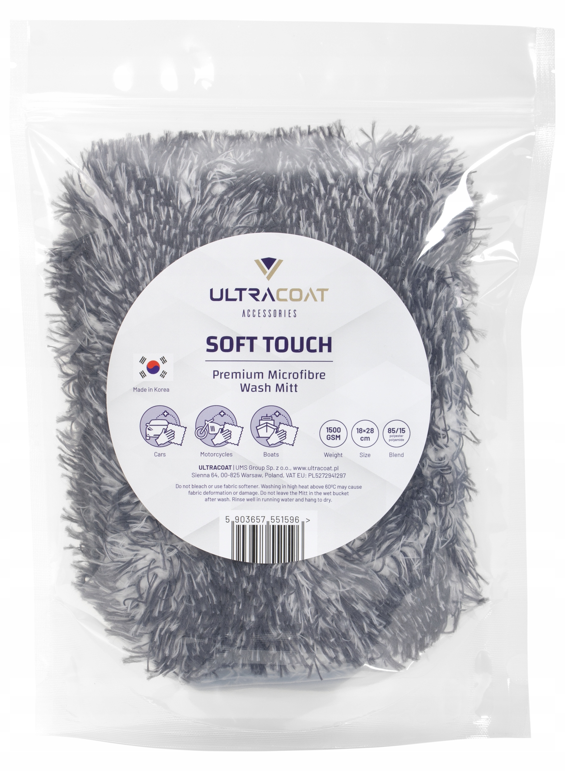 Зручна та міцна рукавиця для миття автомобіля, виготовлена з корейської мікрофібри найвищої якості. Делікатна структура щетини гарантує високу безпеку вимитої поверхні та легке змивання бруду з рукавички. Всередині Soft Touch є двостороння губка, яка чудово вбирає воду та шампунь, забезпечуючи високе ковзання під час миття та полегшуючи роботу.