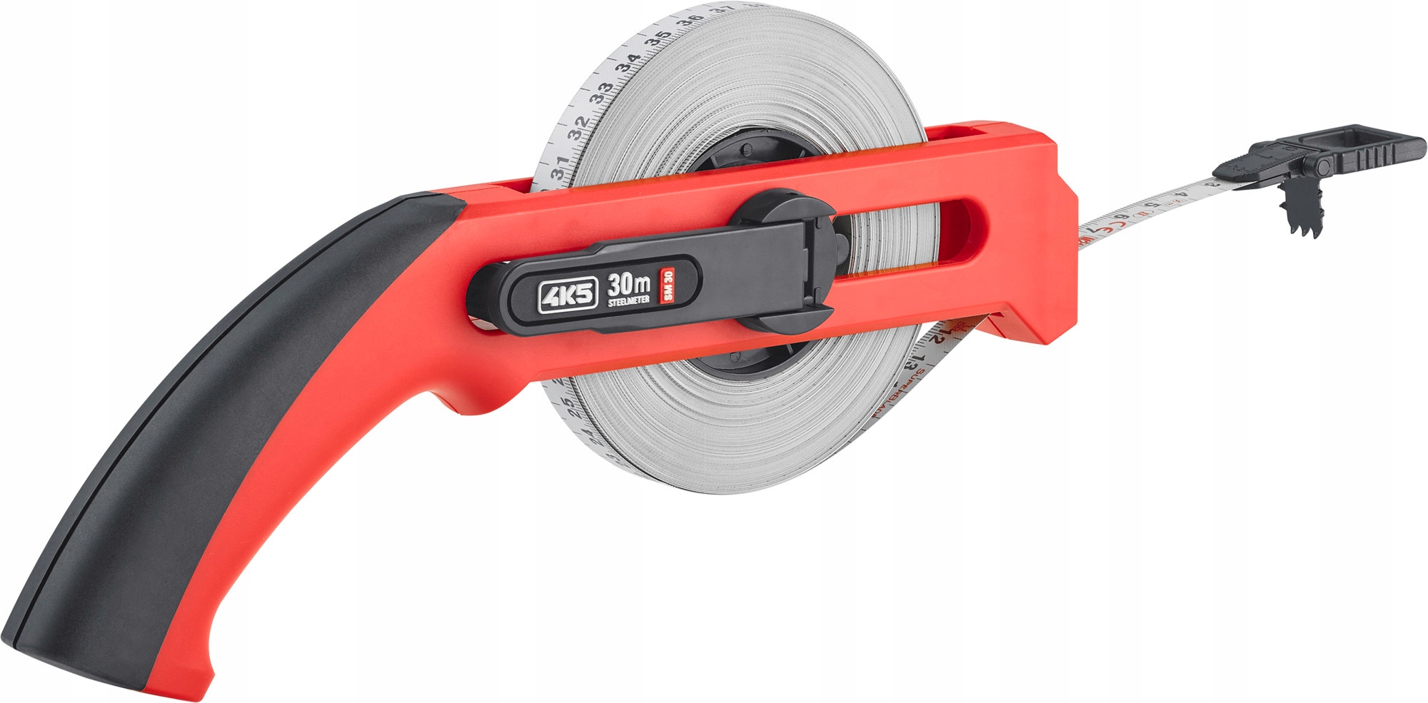 Сільна рулонна рулетка, оснащена ергономічною ручкою та корисним гачком. Покриття сталі нейлоном запобігає швидкому стиранню друку на стрічці.