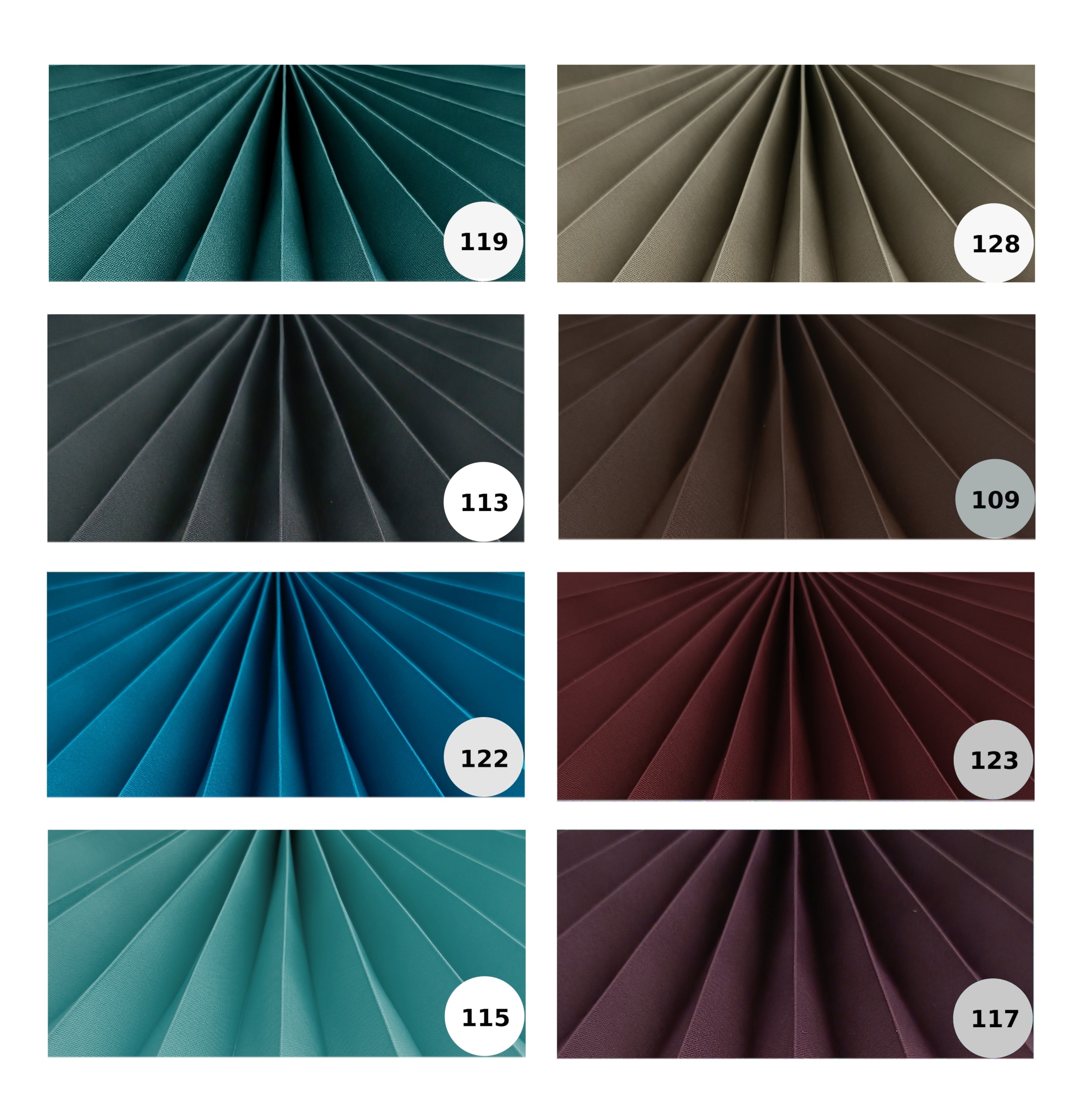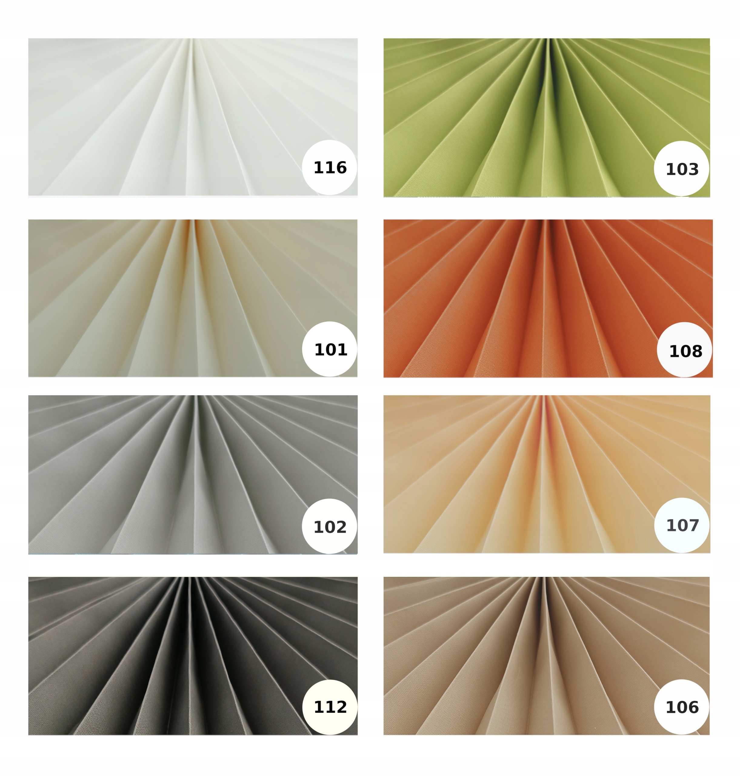 У жалюзі плісе ми використовуємо алюмінієві (ALU) профілі стандартних кольорів. Чотири кольорові версії на вибір: