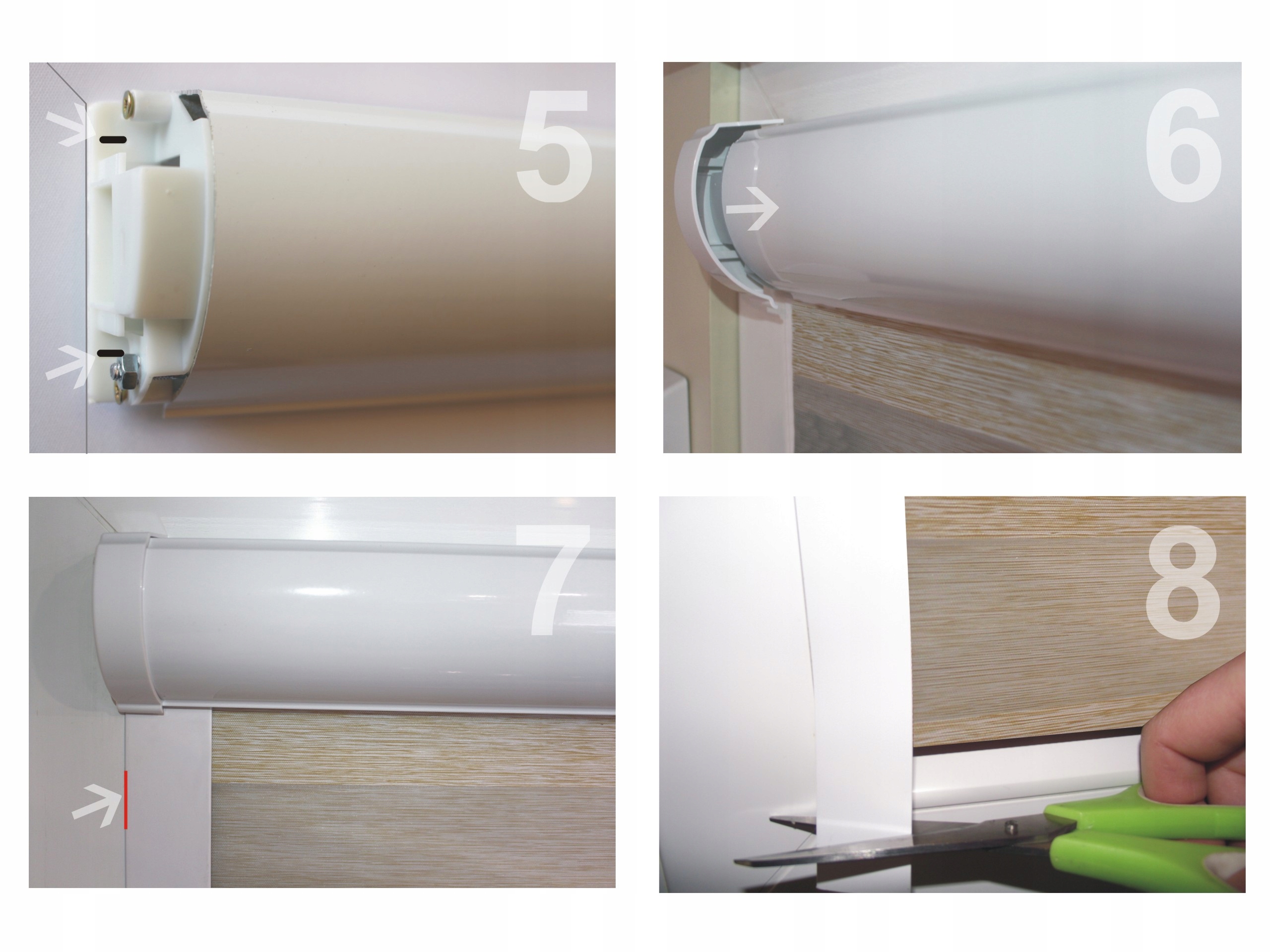 - Тепер ви можете перевірити розгортання та втягування матеріалу рулонних штор. - Потім приклеюємо плоскі напрямні - кришки до штапиків (фото 7).
