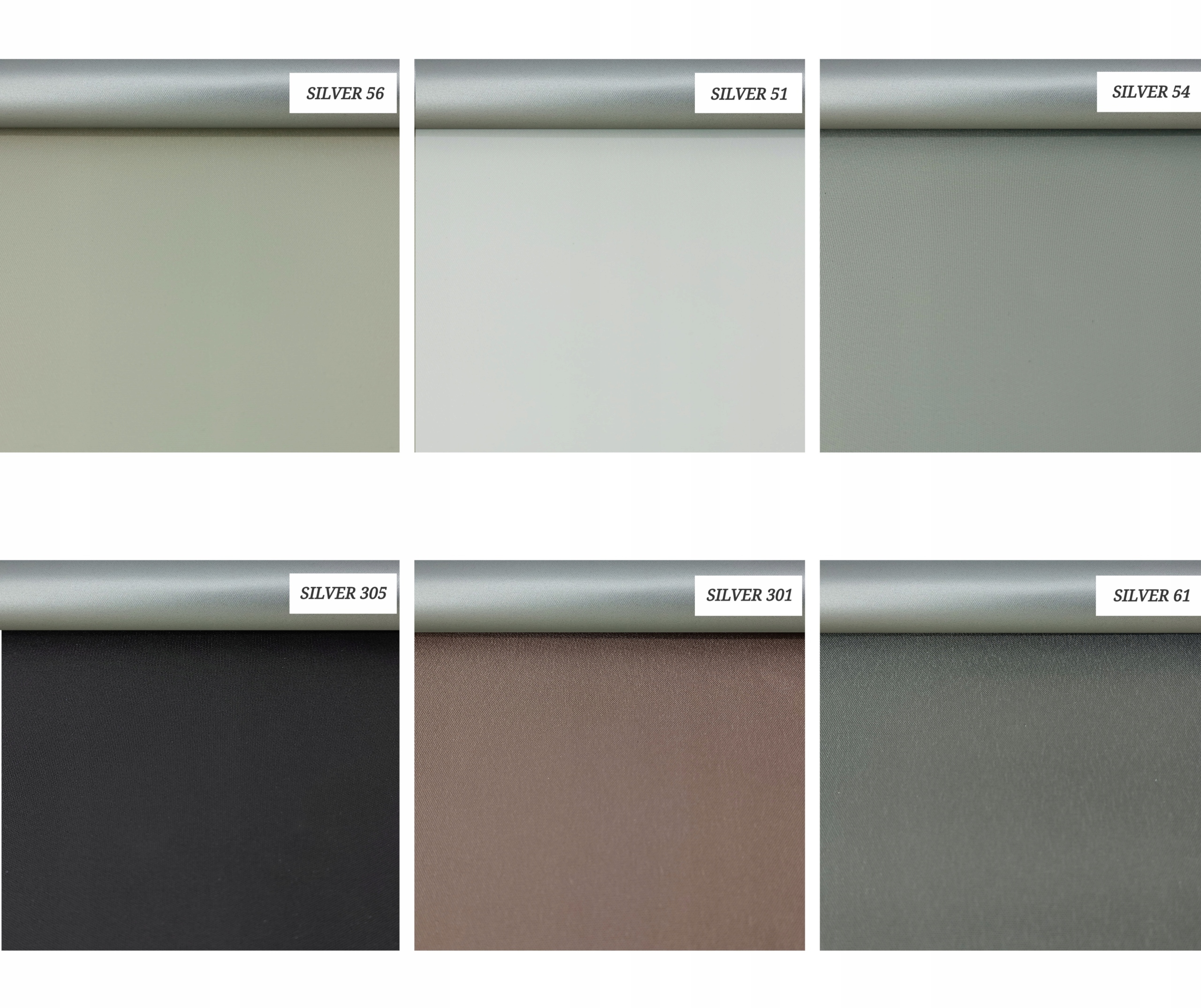 Доступні варіанти кольорів тканини представлені на фотографіях нижче. На кожному зразку також видно зовнішнє сріблясте покриття.
