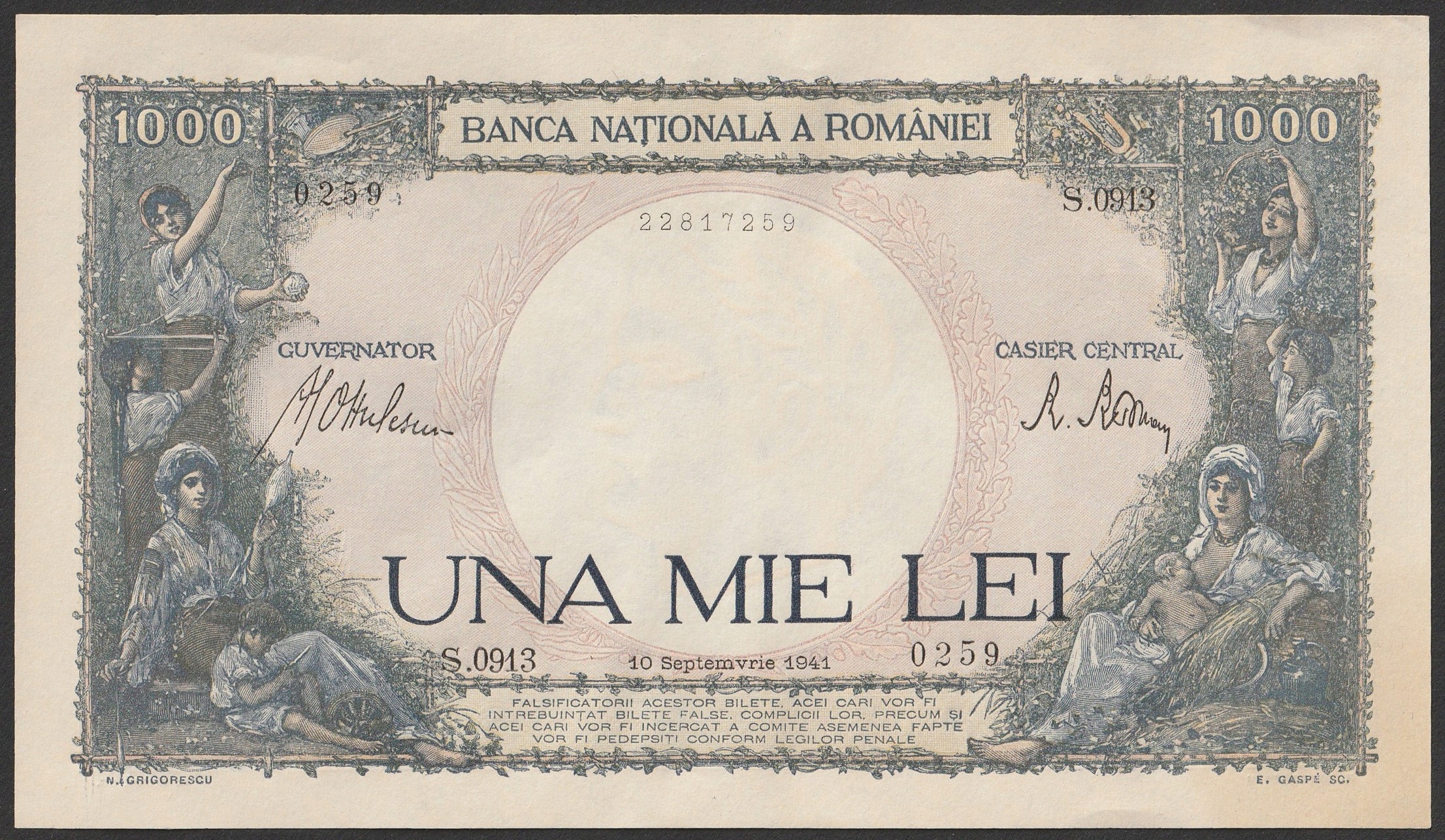 Rumunia 1000 lei 1941 - S - stan bankowy UNC
