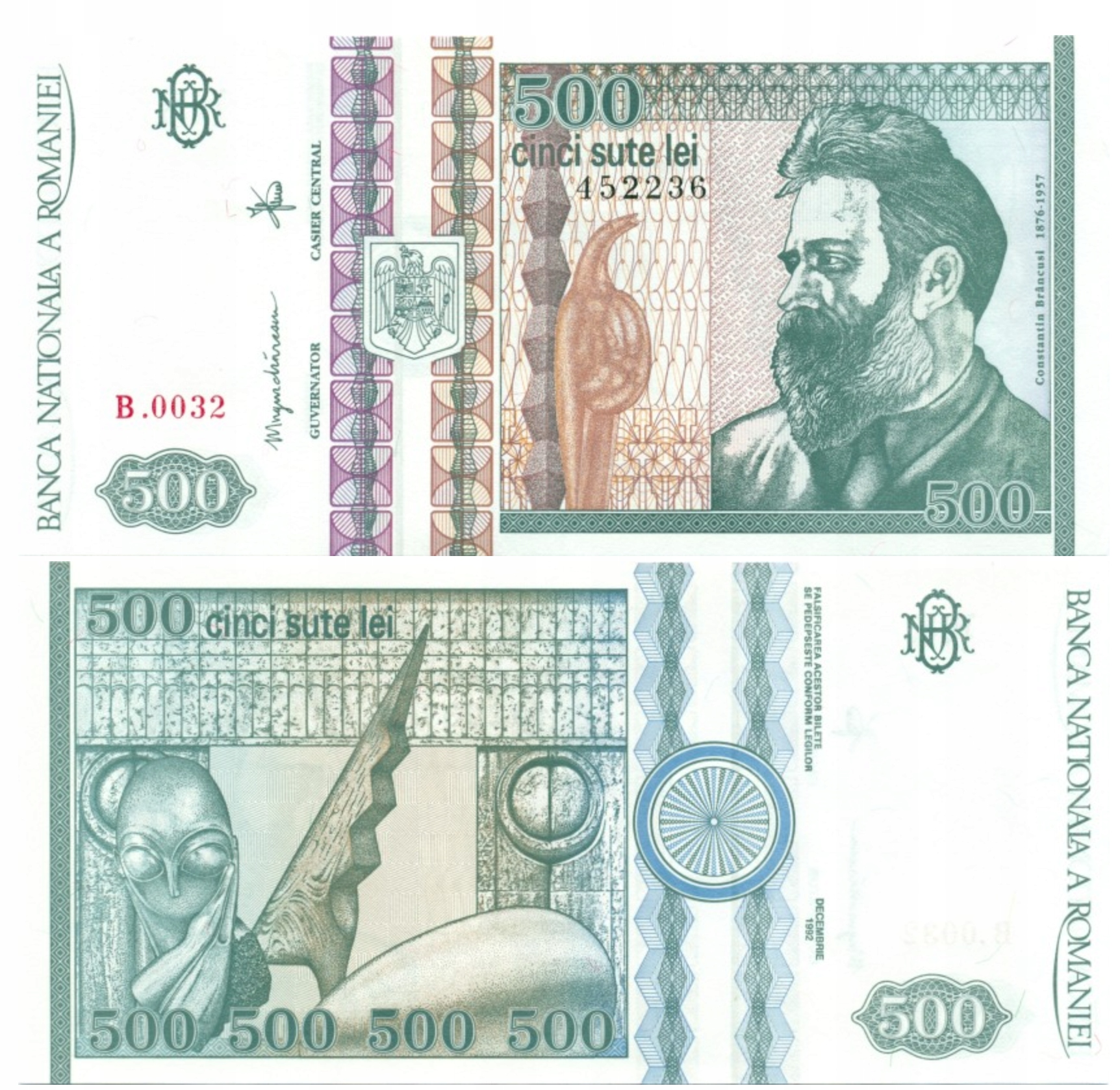 РУМУНІЯ 500 LEI 1992 P-101b(2) UNC, серійний номер банкноти може відрізнятися від зображеного на фото