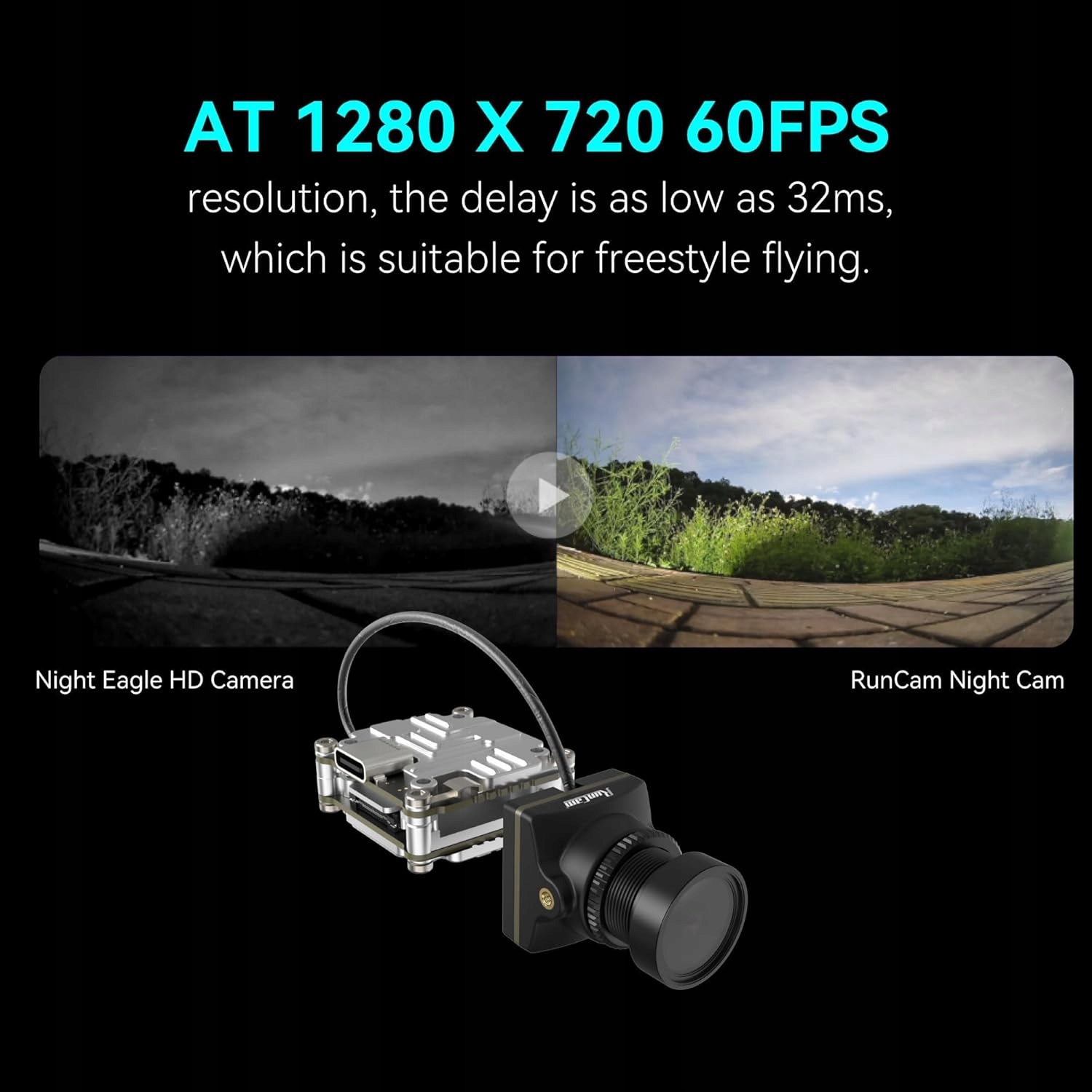 Kit Runcam Night Eagle HD - це вдосконалена система FPV, яка дозволяє насолоджуватися чудовою якістю зображення навіть вночі. Нічна камера Eagle HD пропонує роздільну здатність 720p при 60 кадрів в секунду, що гарантує рідкі та чіткі записи.