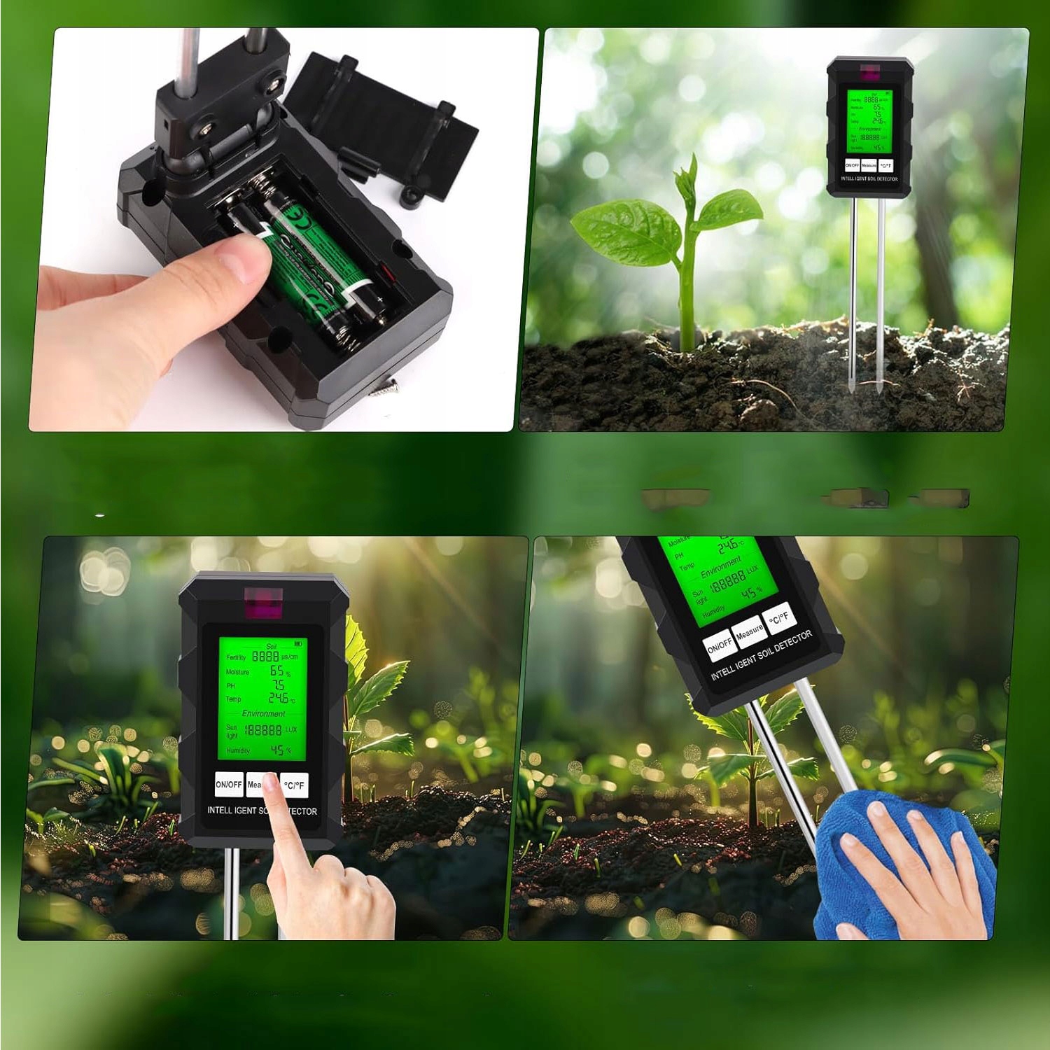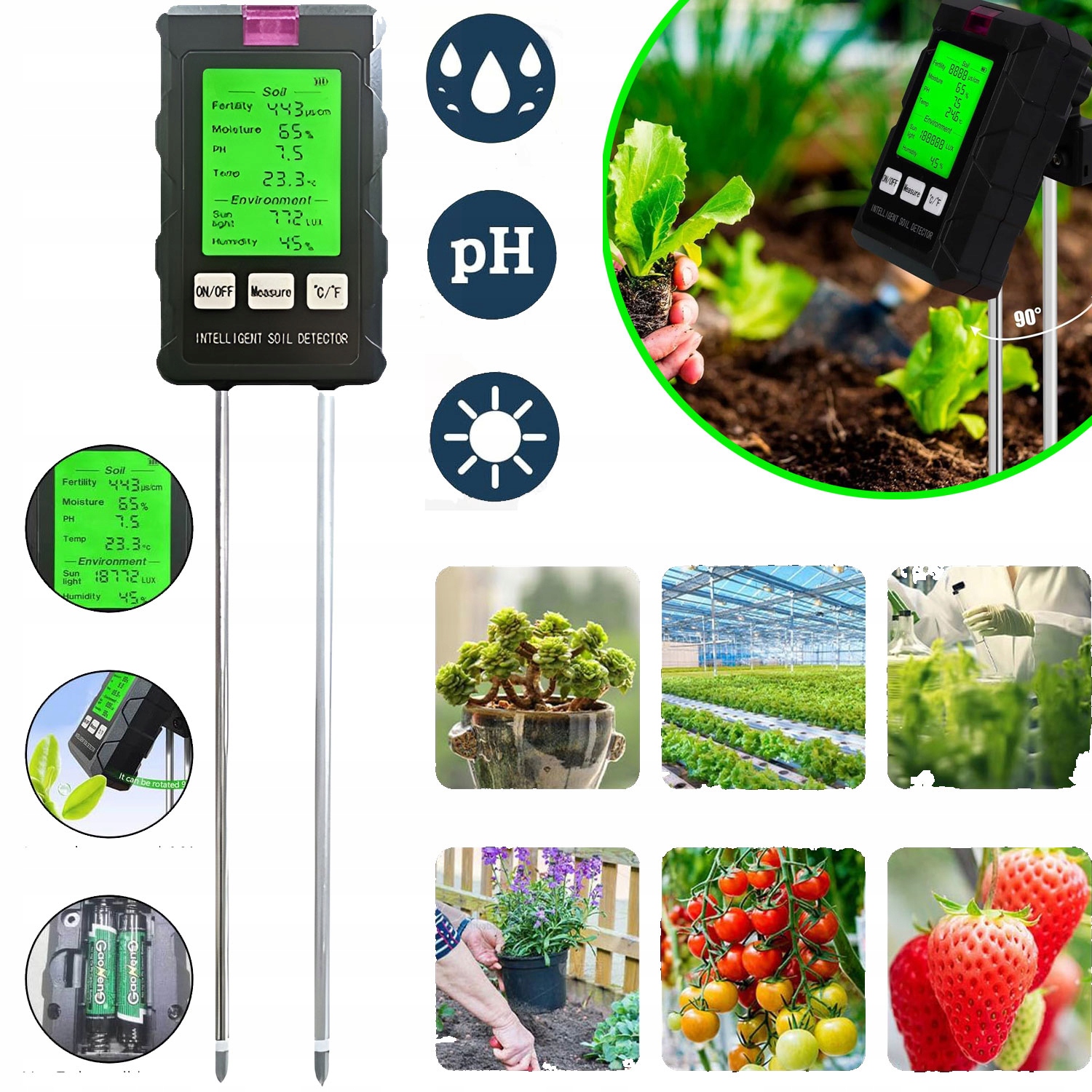 -вана з великим РК-дисплеєм, який чітко показує всі результати вимірювання. Простий у використанні, просто покладіть пристрій у землю і швидко перемикайтеся між різними даними однією кнопкою.