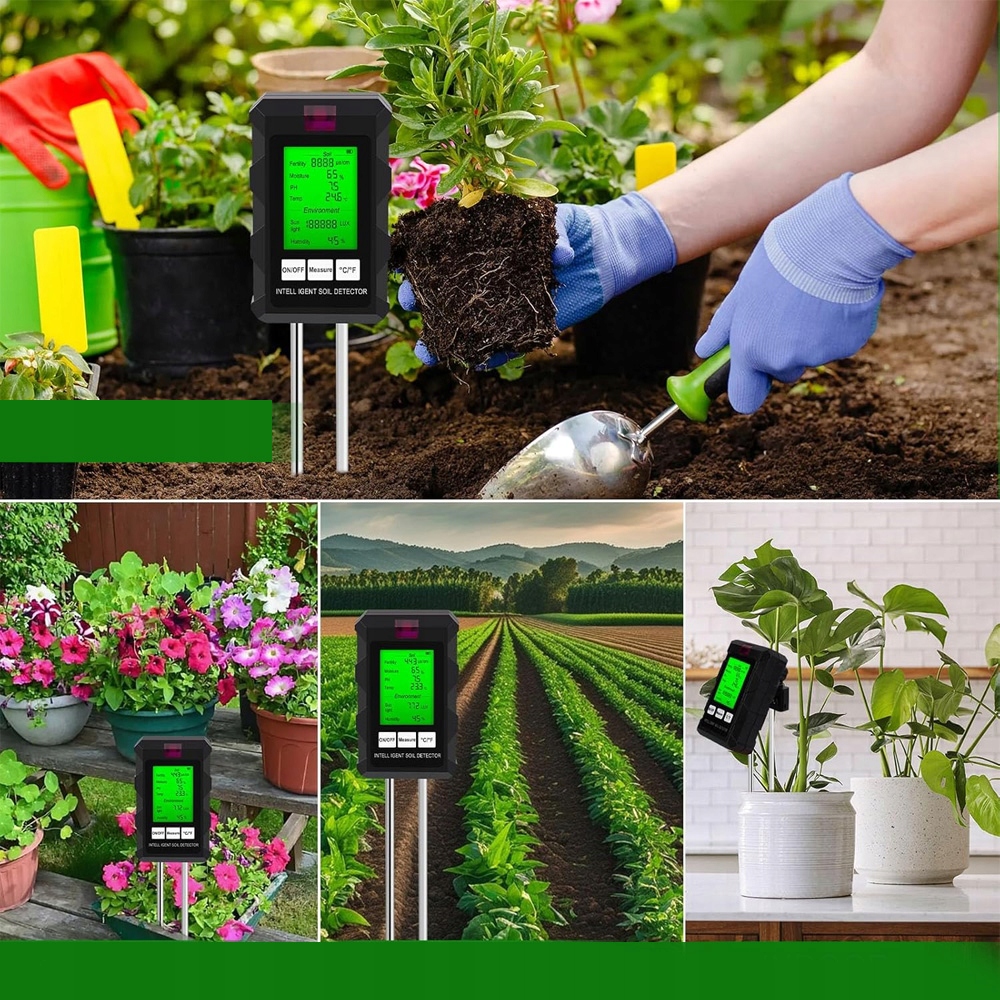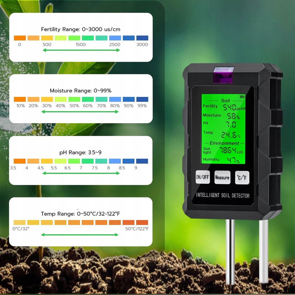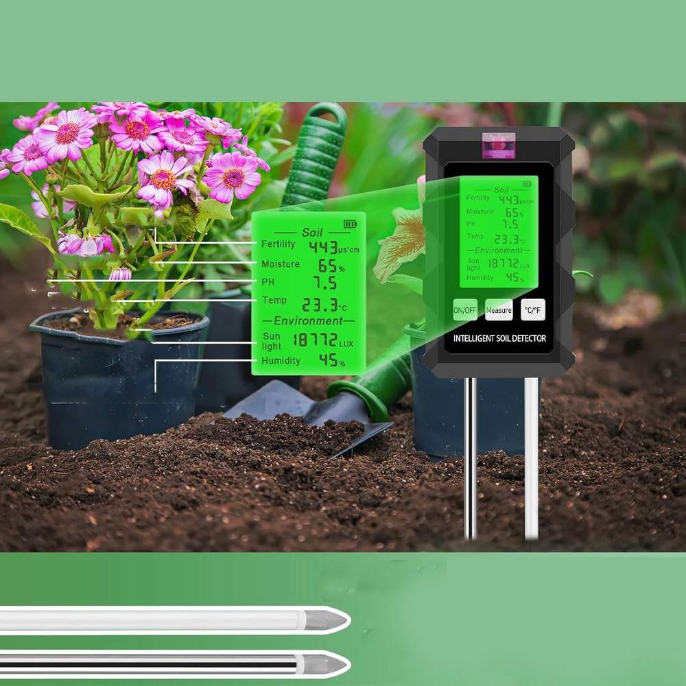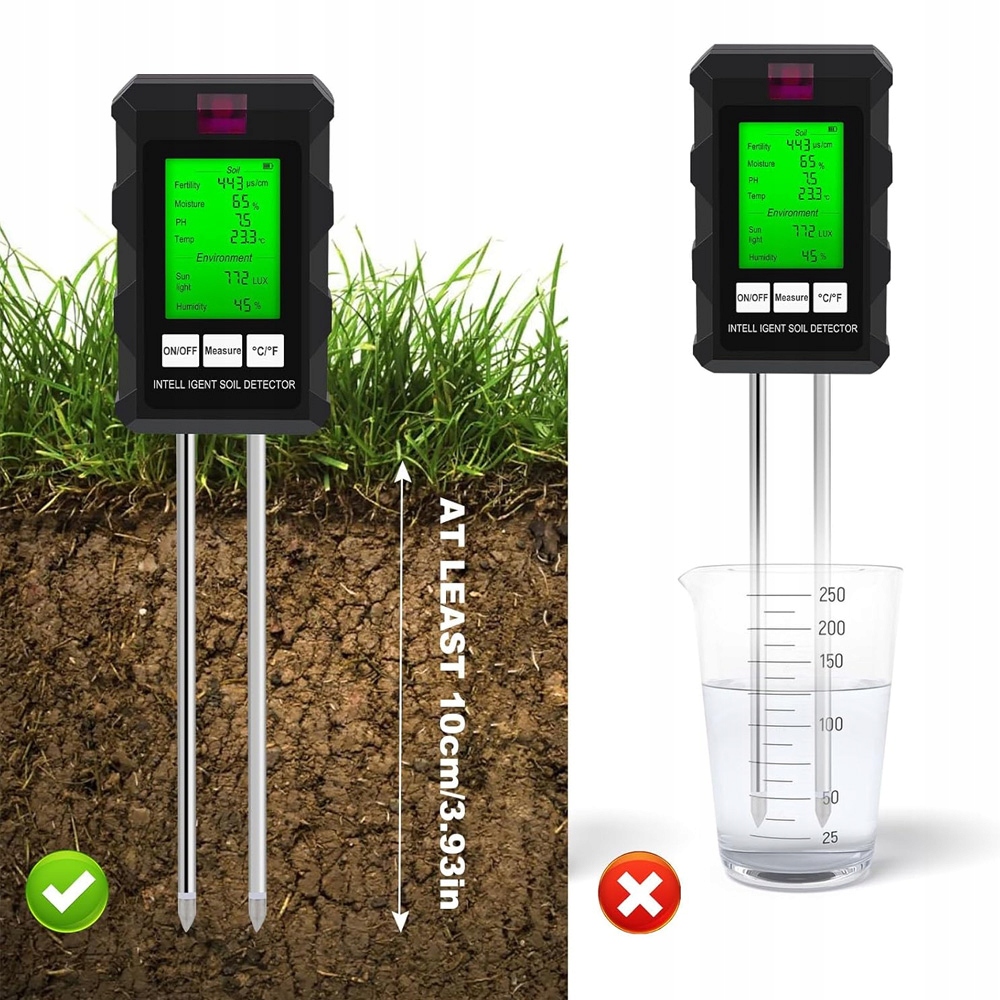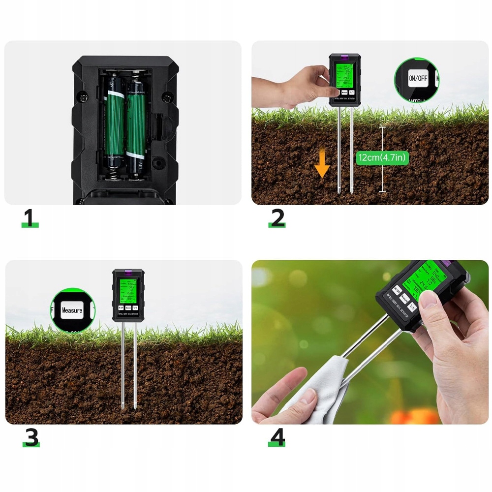 Щойно покладіть 2 батареї AAA (не включені в набір), наклейте зонд у 2/3 глибини в ґрунт і запускають вимірювання - результати з'являються за 10 секунд. Легко чистити і тривати.