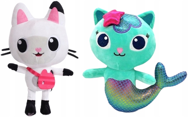 Чарівні м'які м'які тваринки Кітті Пан і Русалка з казки "Хата кота Габі". Ці унікальні м’які тварини зображують маленьке кошеня з рожевою сумочкою та маленьку русалочку з фіолетовим блискучим хвостом і великою морською зіркою на маківці.