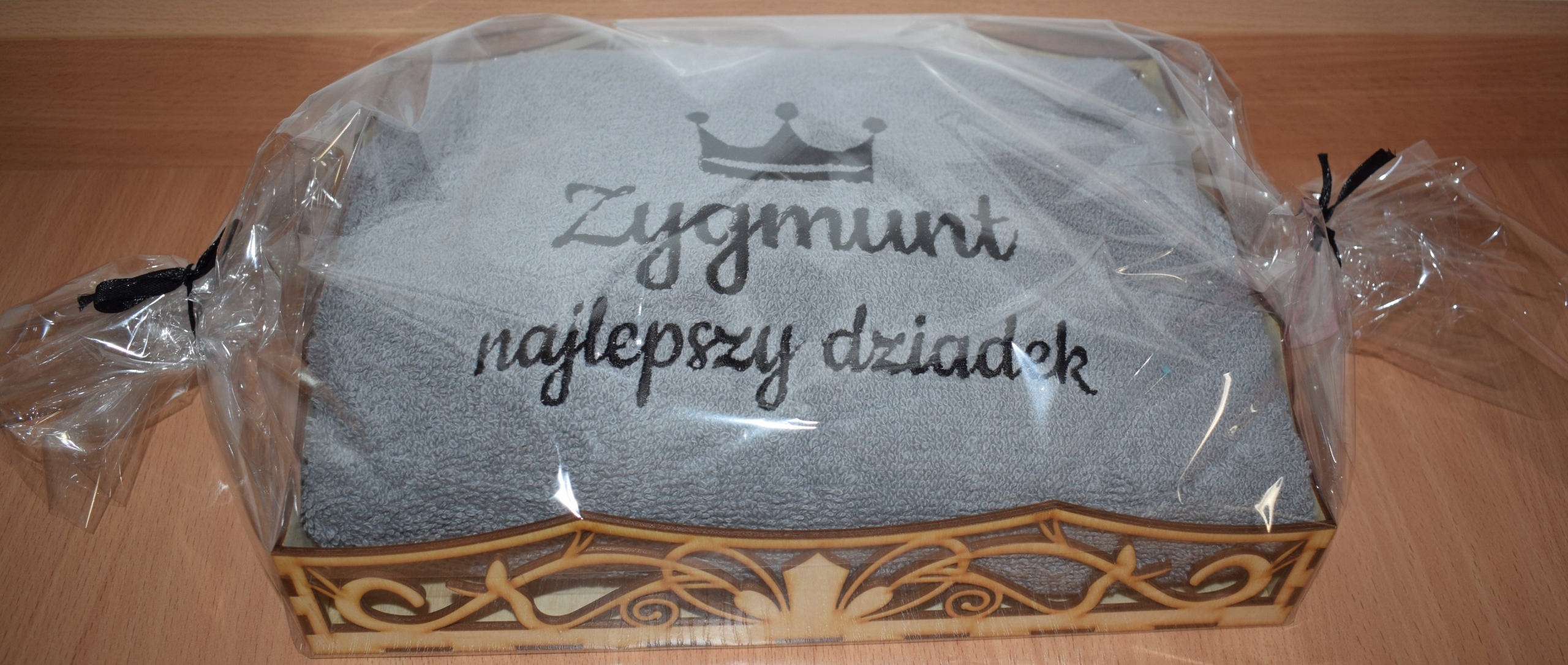 У вартість комплекту входить вишивка на рушнику, яка складається з імені - наприклад ЗИГМУНТ, короткого тексту до 15 символів, наприклад найкращий дідусь і вибрану графіку.