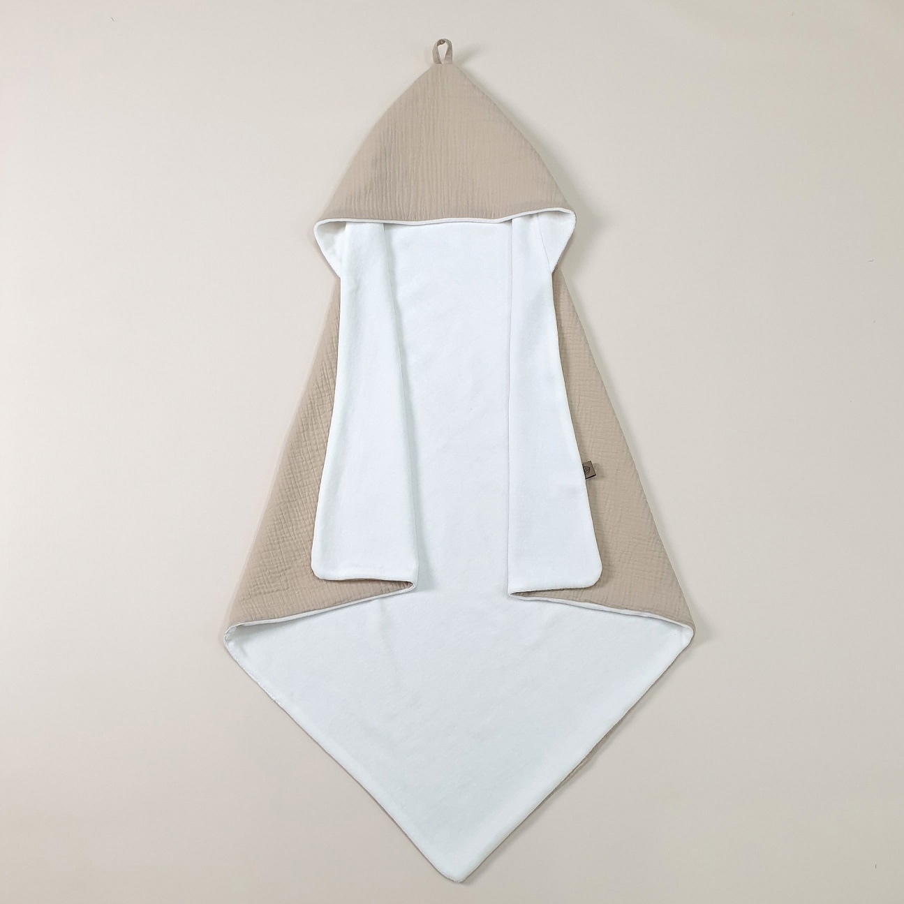 Наш банний рушник складається з двох тканин: мусліну та бавовняної махри, що робить його надзвичайно вбираючим і м’яким. Воно приємне на дотик, створене для ніжної шкіри дитини.