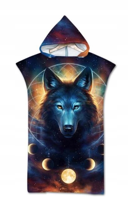 Рушник з капюшоном прикрашений унікальним візерунком вовка та місяця, який приверне увагу на пляжі.