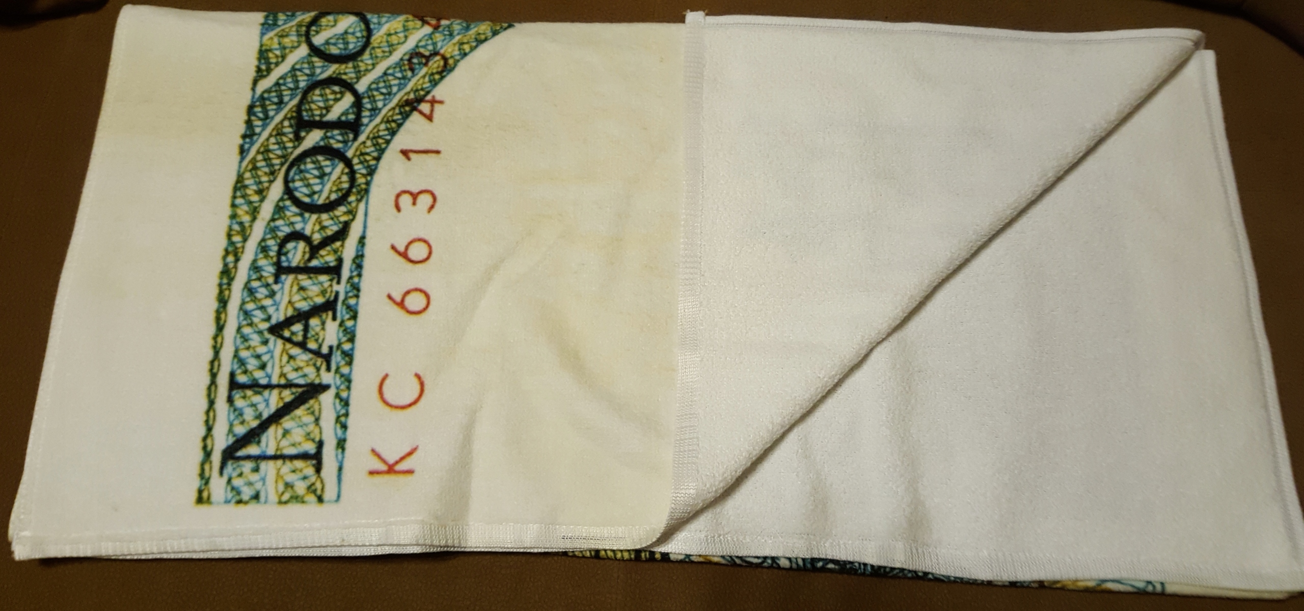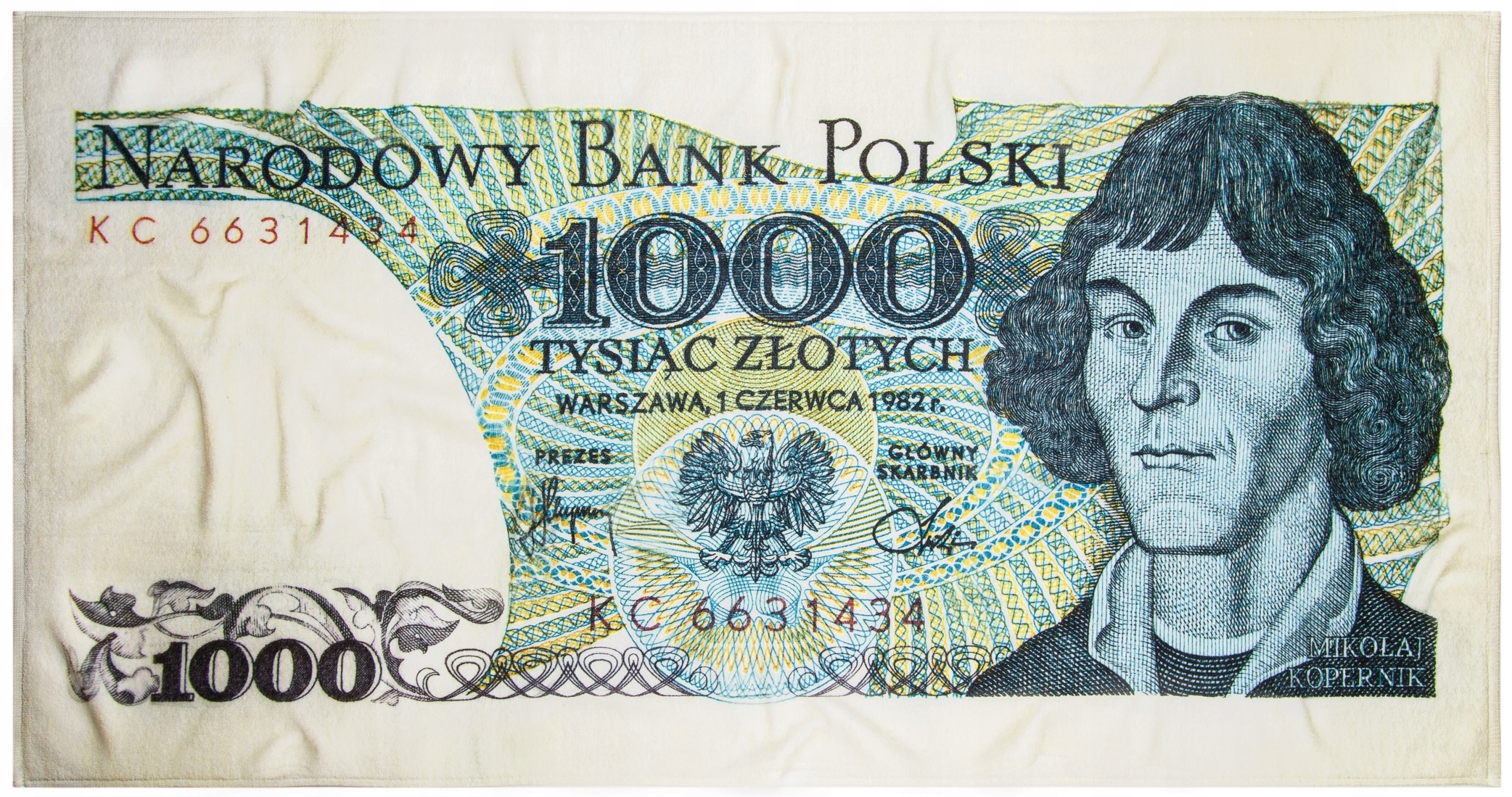 Рушник, що імітує обігову банкноту 1000 PLN 1982 року із зображенням Миколи Коперника.