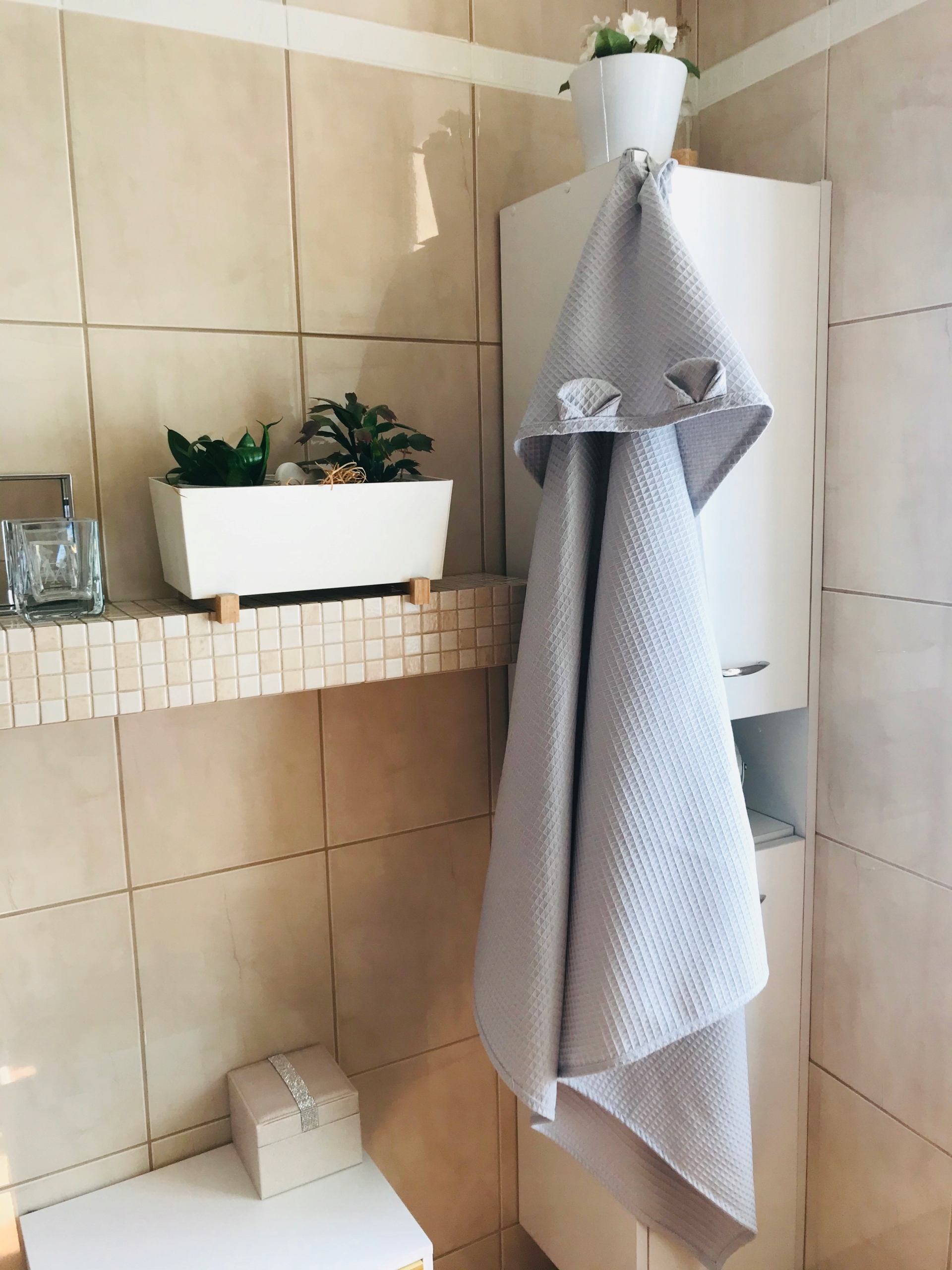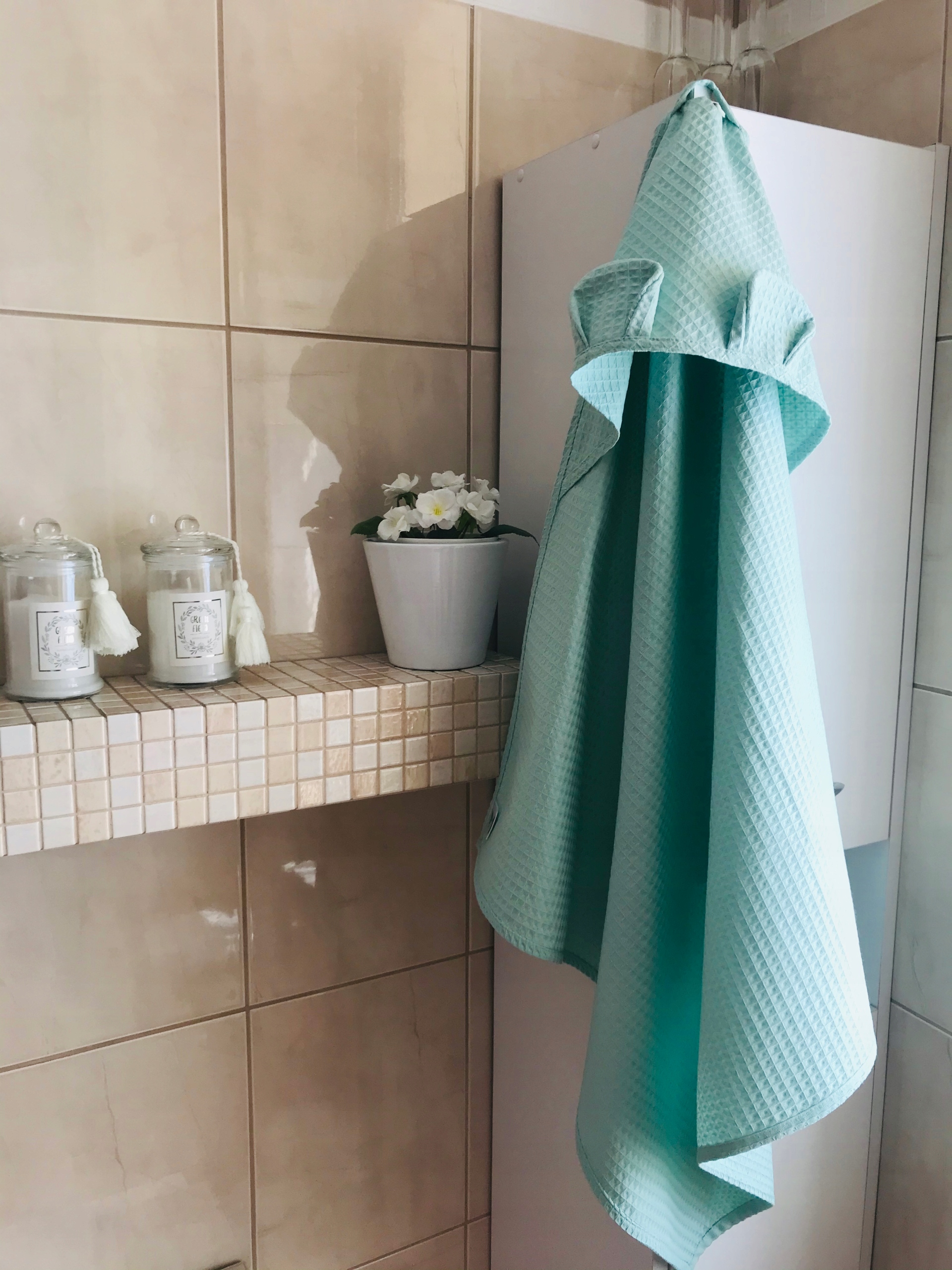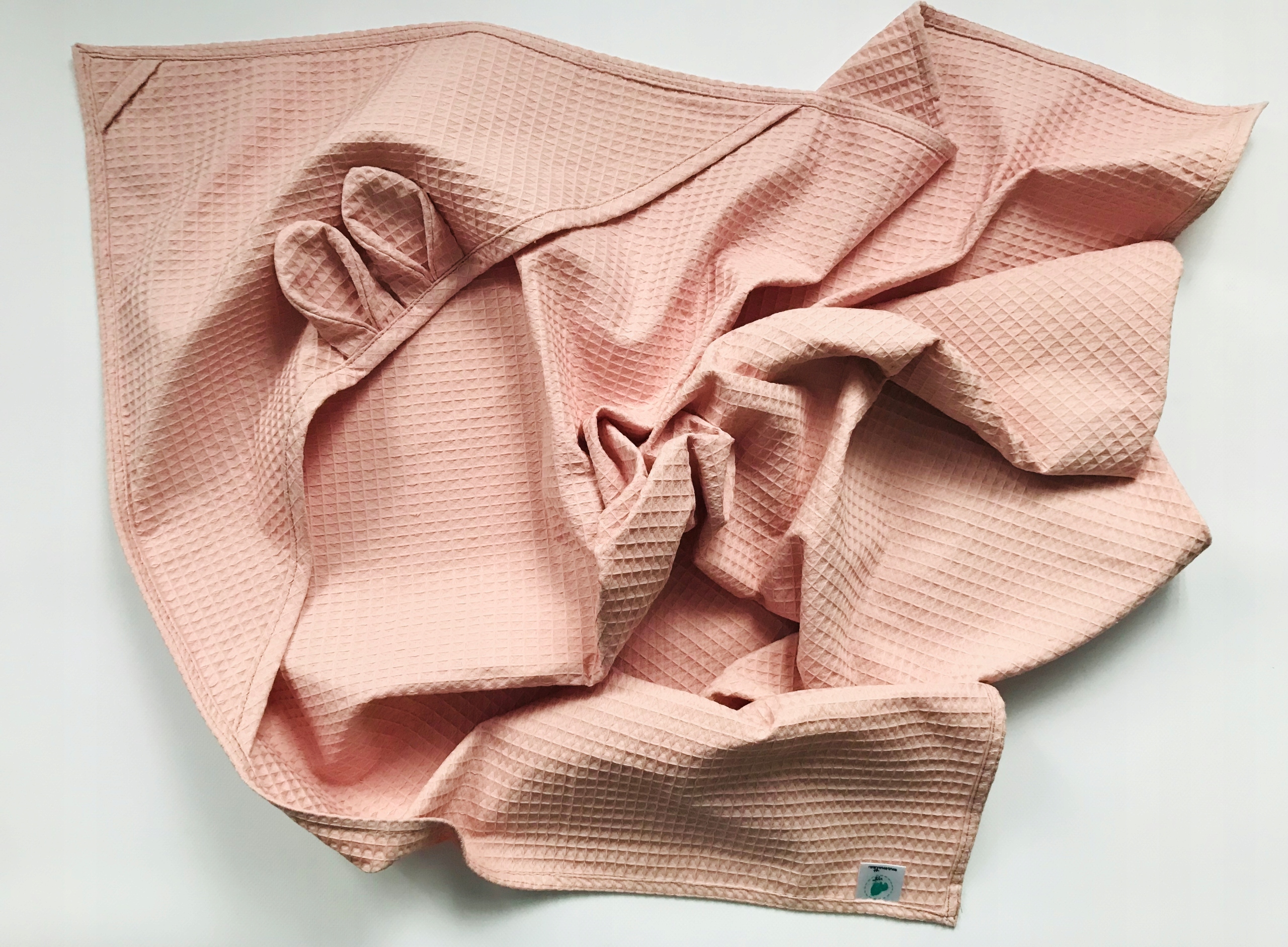 Оригінальний рушник рушник з з капюшоном, виготовлений з натурального b >, бавовняний матеріал з характерною вафельною структурою.