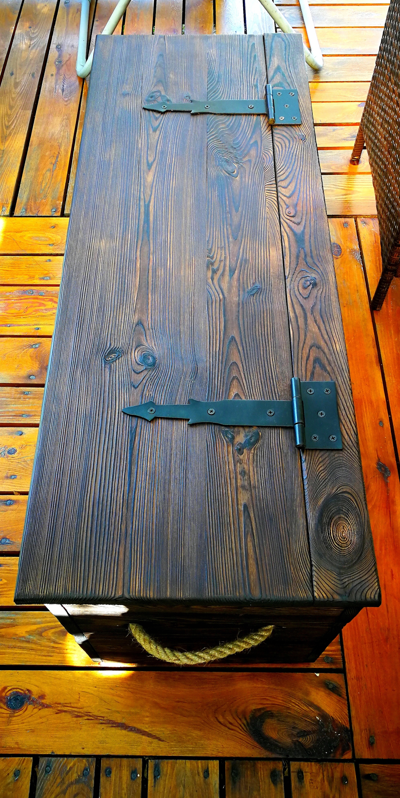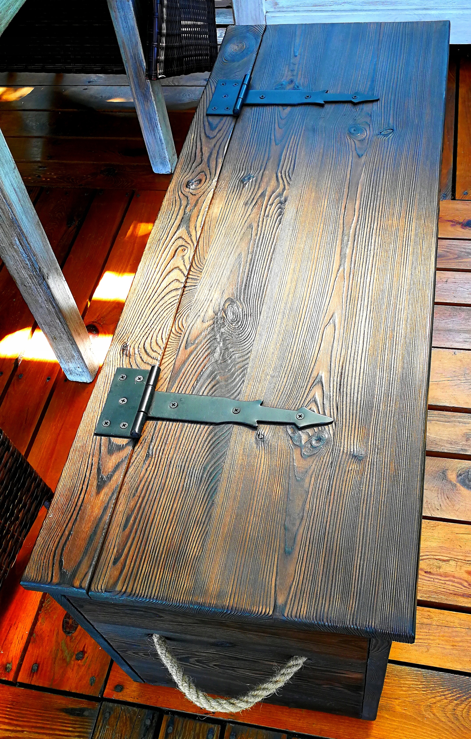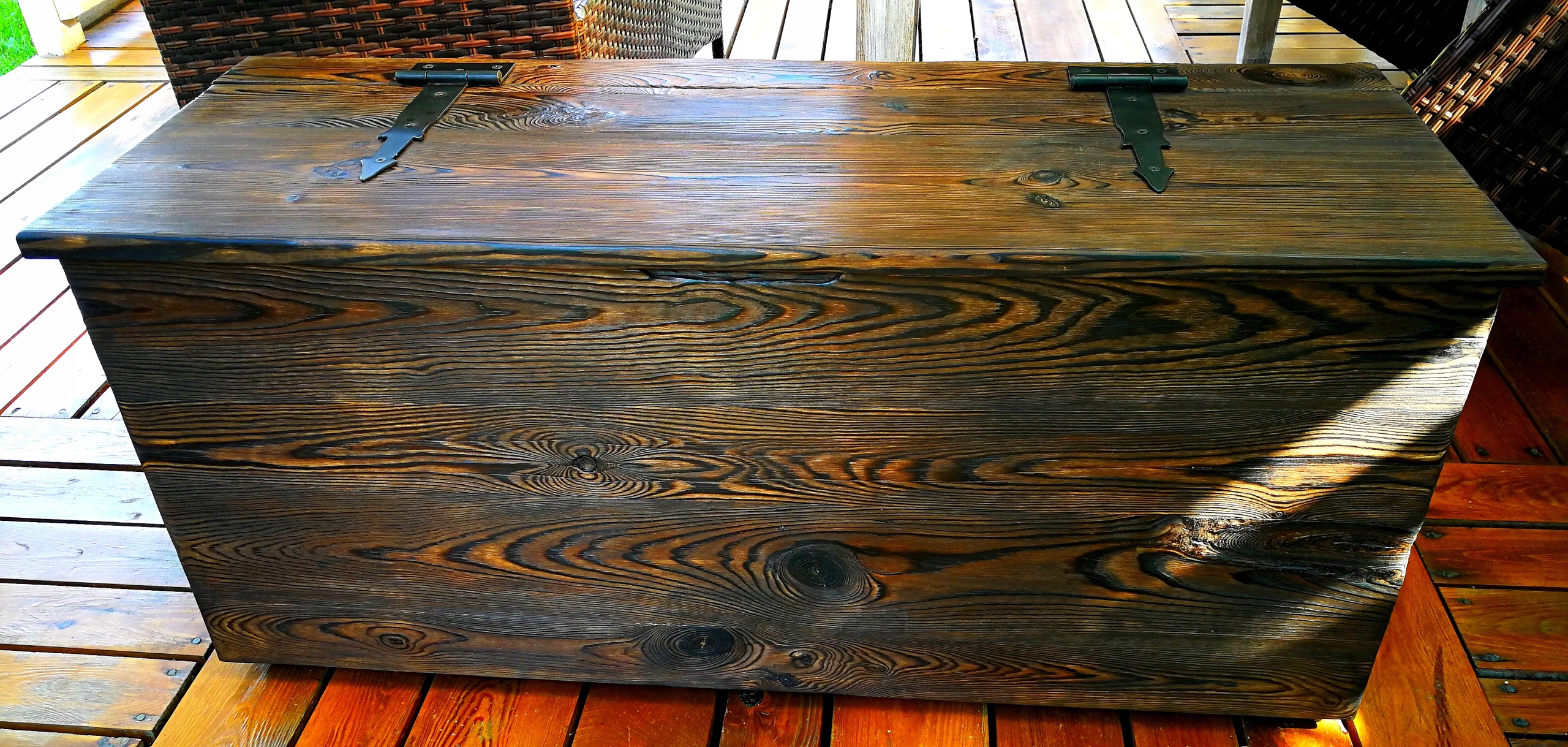 Предметом пропозиції є масивна скриня з масиву сосни, виготовлена спеціальним методом старіння деревини (випалювання вогнем) - виділені зерна та структура.