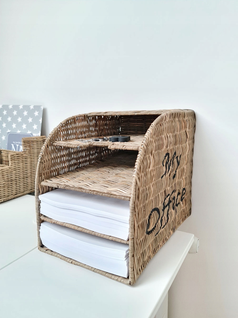 Підставка з ротанга Rustic Hampton для зберігання документів з написом "Мій офіс" на столі або комоді. Чорний напис чорним з одного боку, це практично і привертає увагу.