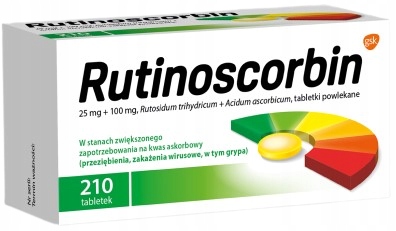 Діючі речовини Рутиноскорбіну: рутозид і аскорбінова кислота В 1 таблетці міститься 25 мг рутозиду і 100 мг аскорбінової кислоти. Допоміжні речовини: ядро таблетки лактози моногідрат, крохмаль картопляний, сахароза, магнію стеарат, тальк, спирт полівініловий, склад оболонки: опадрай II 85F32876 жовтий (спирт полівініловий, макрогол 4000, титану діоксид), тальк, хіноліновий жовтий (Е104).