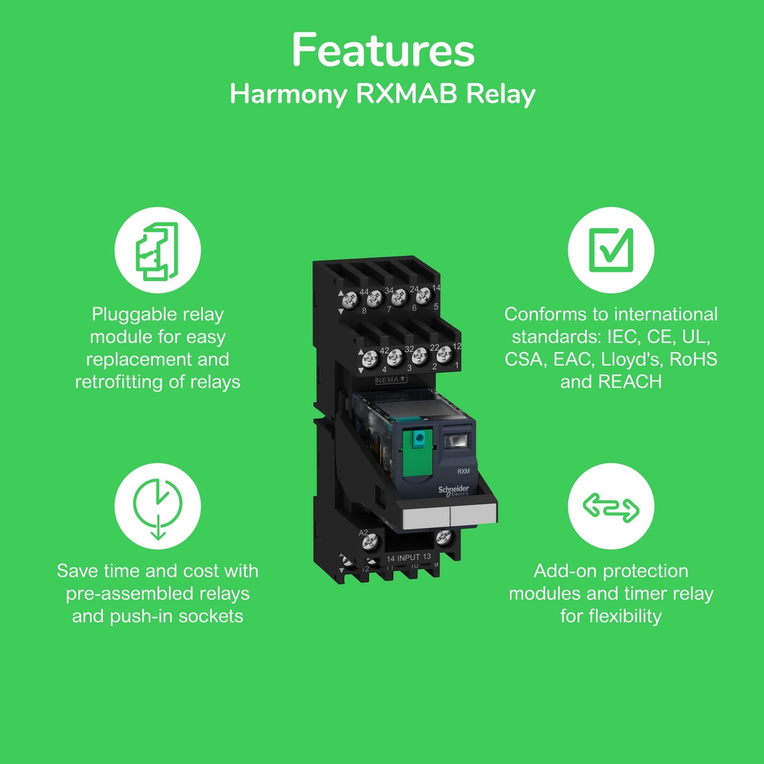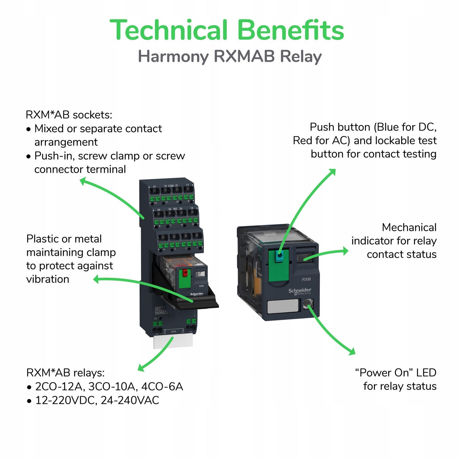Мініатюрні реле RXM є частиною електромеханічних реле Harmony. Це вставне реле для монтажу на гнізді RXZE. Він також пропонує одноступеневу кнопку перевірки блокування та індикатор стану механічного контакту. Кнопка тестування миттєво активується натисканням синьої кнопки на передній панелі та блокується поворотом зеленої частини вгору. Механічний індикатор розташований поруч із кнопкою перевірки, де помаранчевий прапорець вказує на стан контакту реле. Зелений світлодіод на передній панелі засвітиться, коли реле ввімкнено. Індикатор стану зі світлодіодом: чітка індикація як вдень, так і вночі. Це екологічно чистий продукт преміум-класу, який відповідає міжнародним стандартам і сертифікатам, таким як IEC, CE, UL, CSA, EAC, Lloyd's, RoHS і REACH. Реле RXM слід використовувати з гніздом RXZE (гвинтова клема, гвинтовий з’єднувач, вставна клема). Для захисту від вібрації до розетки можна додати пластиковий/металевий хомут. Також доступні модулі захисту та легенда маркування.