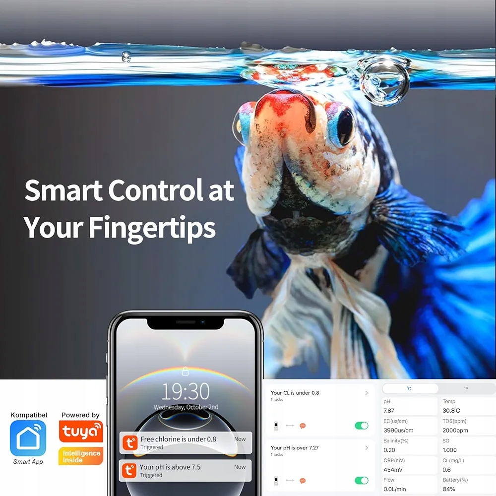 Підключення Wi-Fi: Завдяки модулю Wi-Fi та безкоштовному програмі Tuya Smart, ви можете контролювати всі ключові значення води в режимі реального часу з будь-якого місця.