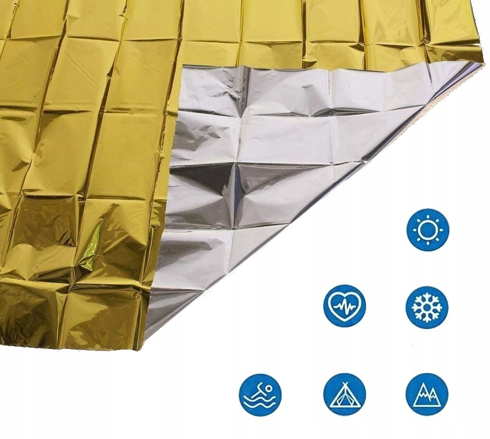 *⃣ золота сторона до тіла - захищає від перегріву, що відображає сонячне світло. Тепло тіла.