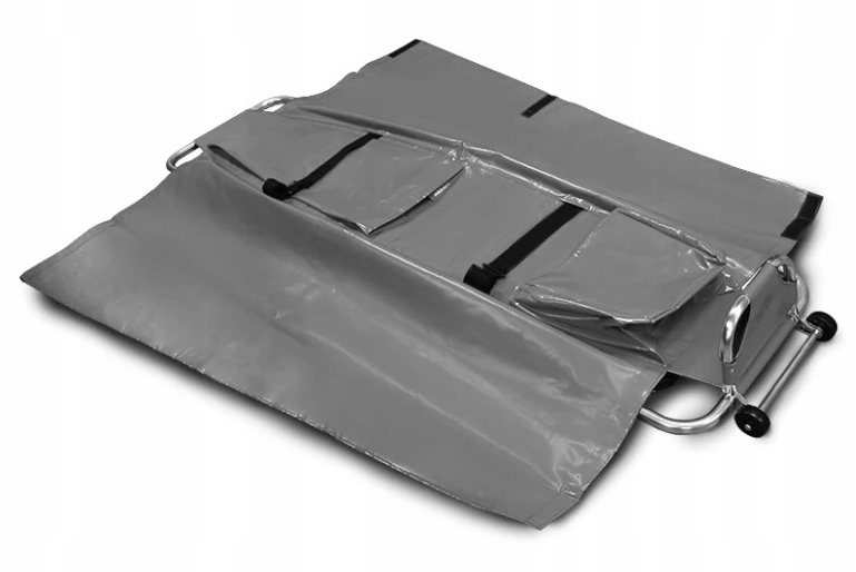 Max — найдовша модель носилок для транспортування тіл, додатково оснащена підставкою для ніг і вшитим чохлом. Профіль полегшує утримання носилок, а складні колеса полегшують транспортування.