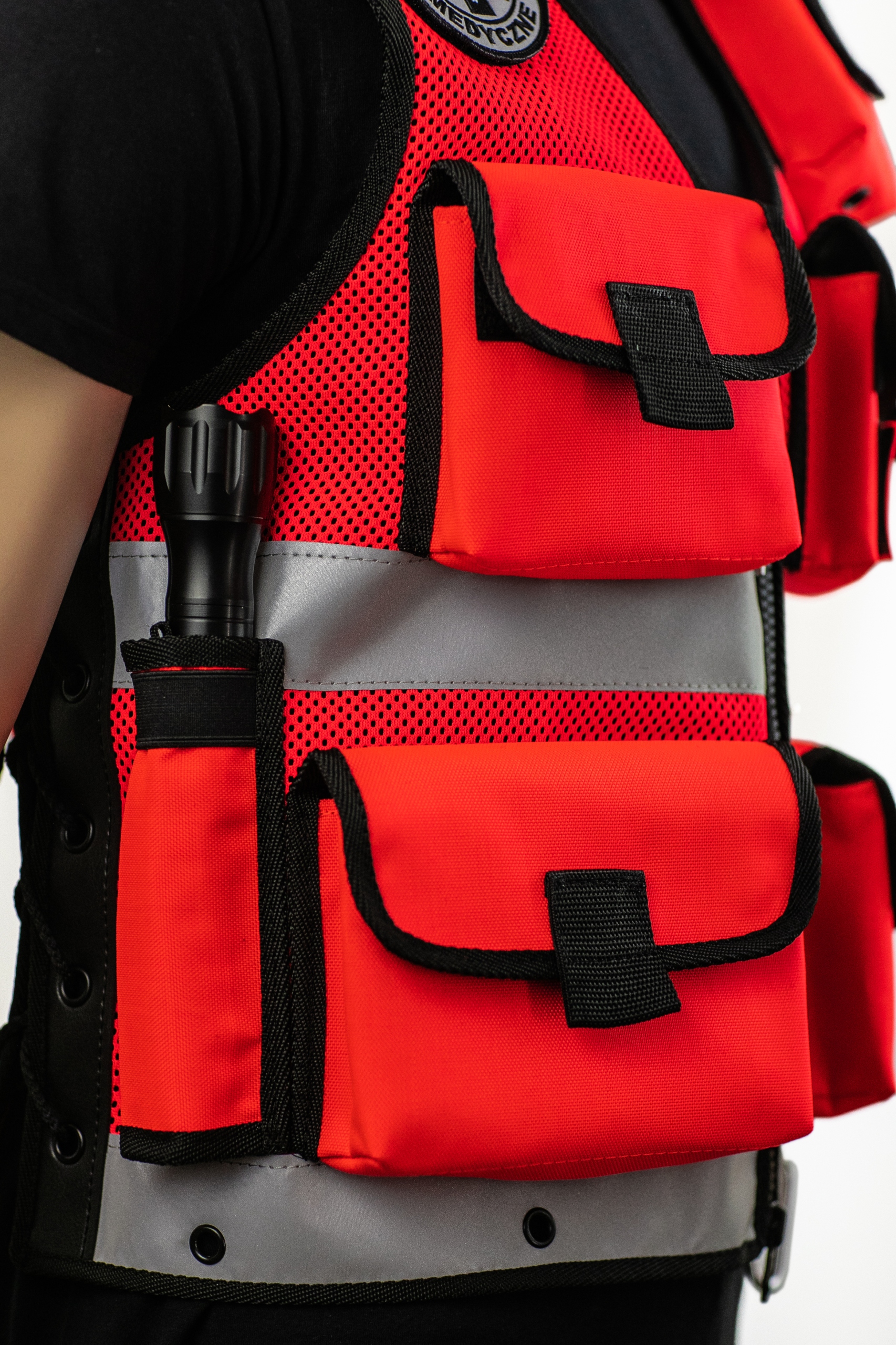 Тактичний жилет для екстреної медичної допомоги. Виготовлений із міцної флуоресцентної сітки щільністю 282 г/м2, що характеризуєтьсявисокою довговічністю у поєднанні з водонепроникною флуоресцентною кордурою в сумісному кольорі згідно з стандартом PN-EN 471 (Постанова Міністра охорони здоров'я від 18 жовтня 2010 р.)