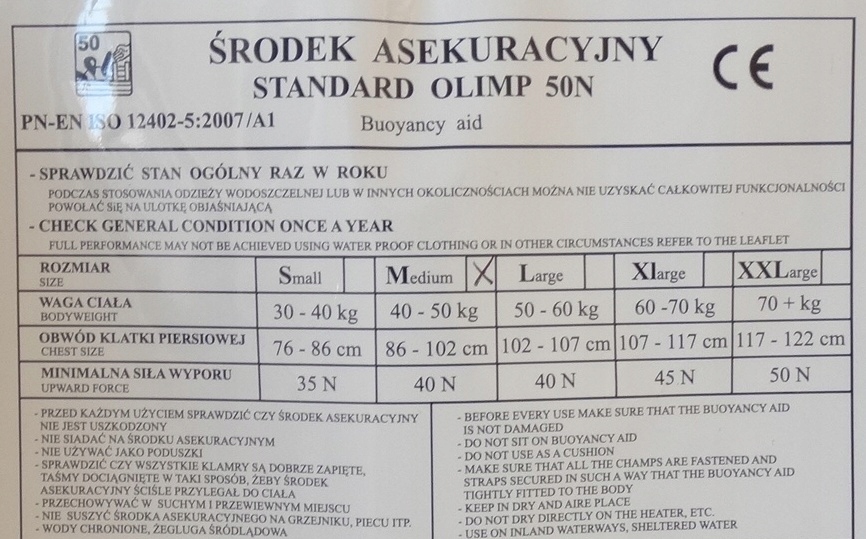 Рятувальний жилет для рибалок від відомої компанії "ОЛІМП" призначений для використання в захищених водоймах, особливо для мисливців і рибалок. Виготовлений з камуфляжної тканини, що дозволяє «зливатися» з фоном. Жилет дуже простий у використанні та підлаштовується під тіло користувача. Застібається на пряжку. Конструкція жилета забезпечує свободу рухів людині в легкому одязі. Його безпечно носити, легко одягати та використовувати. Жилет має водотоннажність не менше 50Н. Використана плавучість означає, що він може легко утримувати людину на плаву у воді. Доступні розміри: M, L, стандарти PN-EN ISO 12402-5.
