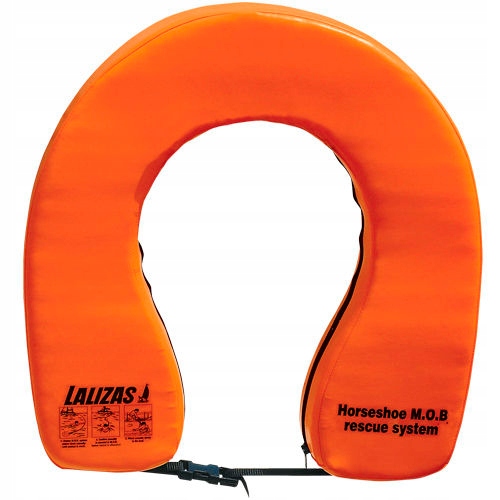 Високоякісний рятувальний буй у формі підкови з пінопласту в оранжевому пластиковому чохлі на блискавці. Призначений для використання як рятувальний засіб у внутрішньому судноплавстві. Ремінь безпеки закривається кліпсою.