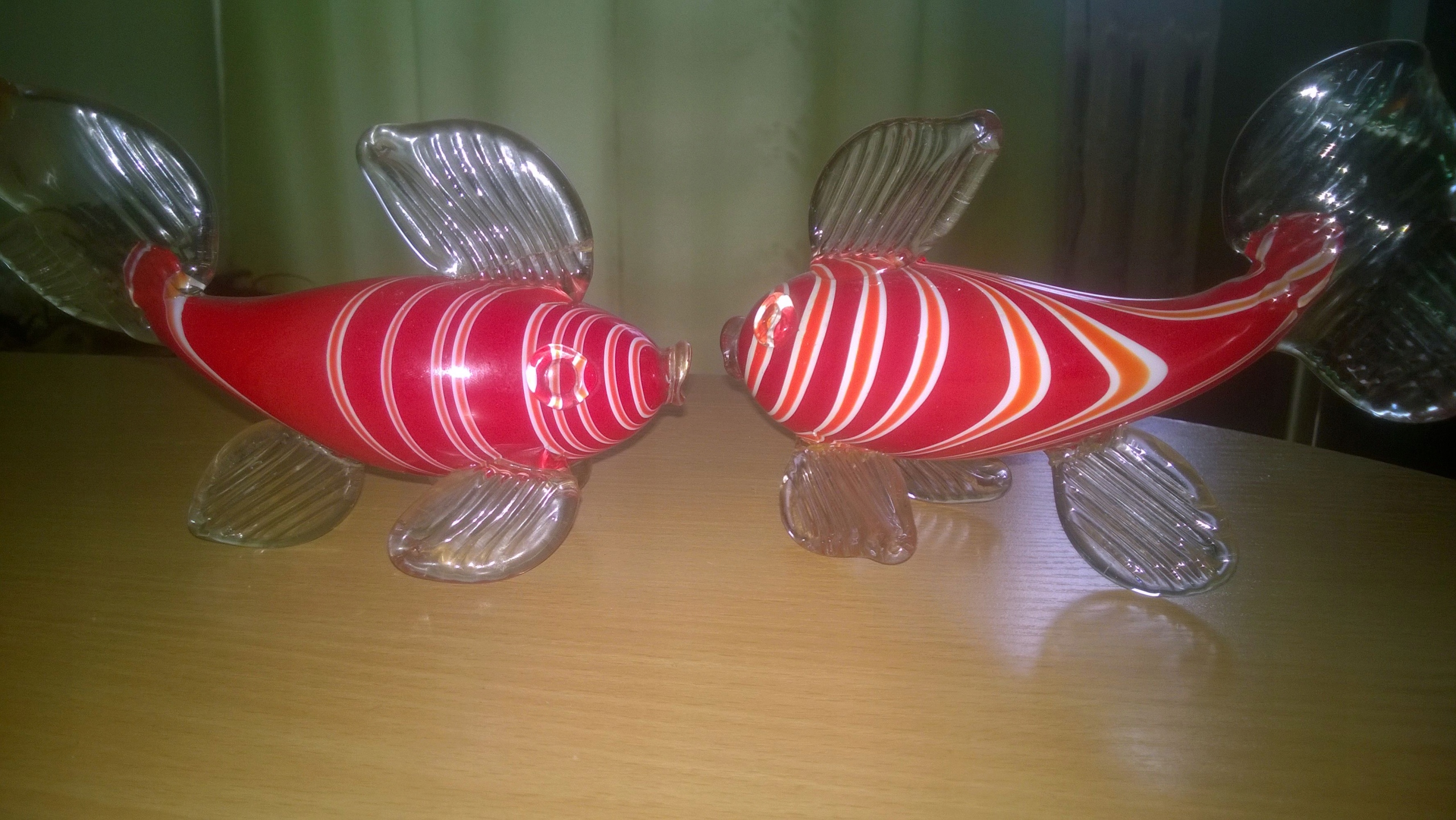 В іншого склеєні всі нижні плавці (зламаний біля основи) і верхній/спинний плавник (більш помітний) і самий кінчик хвостового плавця відламаний.