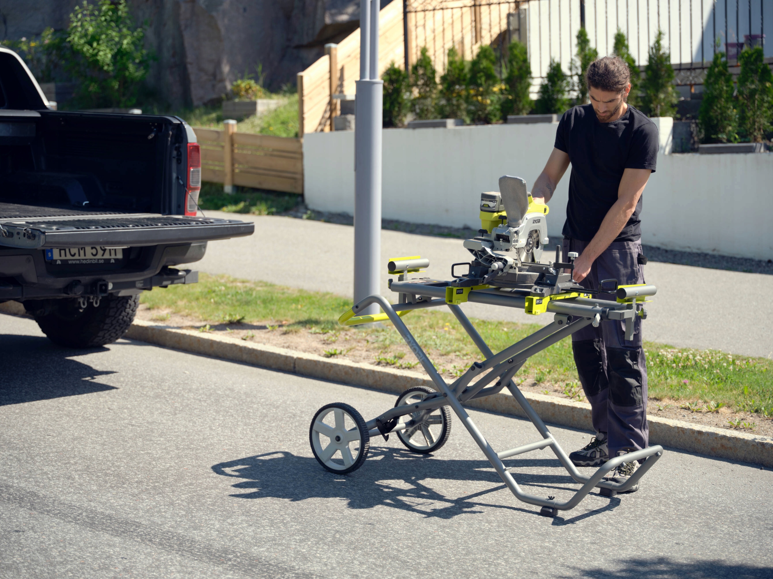 Розпильний стіл RLSW01 від Ryobi є ідеальним робочим столом як для професіоналів, так і для ентузіастів DIY. Підставка складається вертикально і оснащена транспортувальними колесами для зручного зберігання в майстернях, гаражах або багажниках. Крім того, підставка має блокування коліс і систему легкого підйому.
