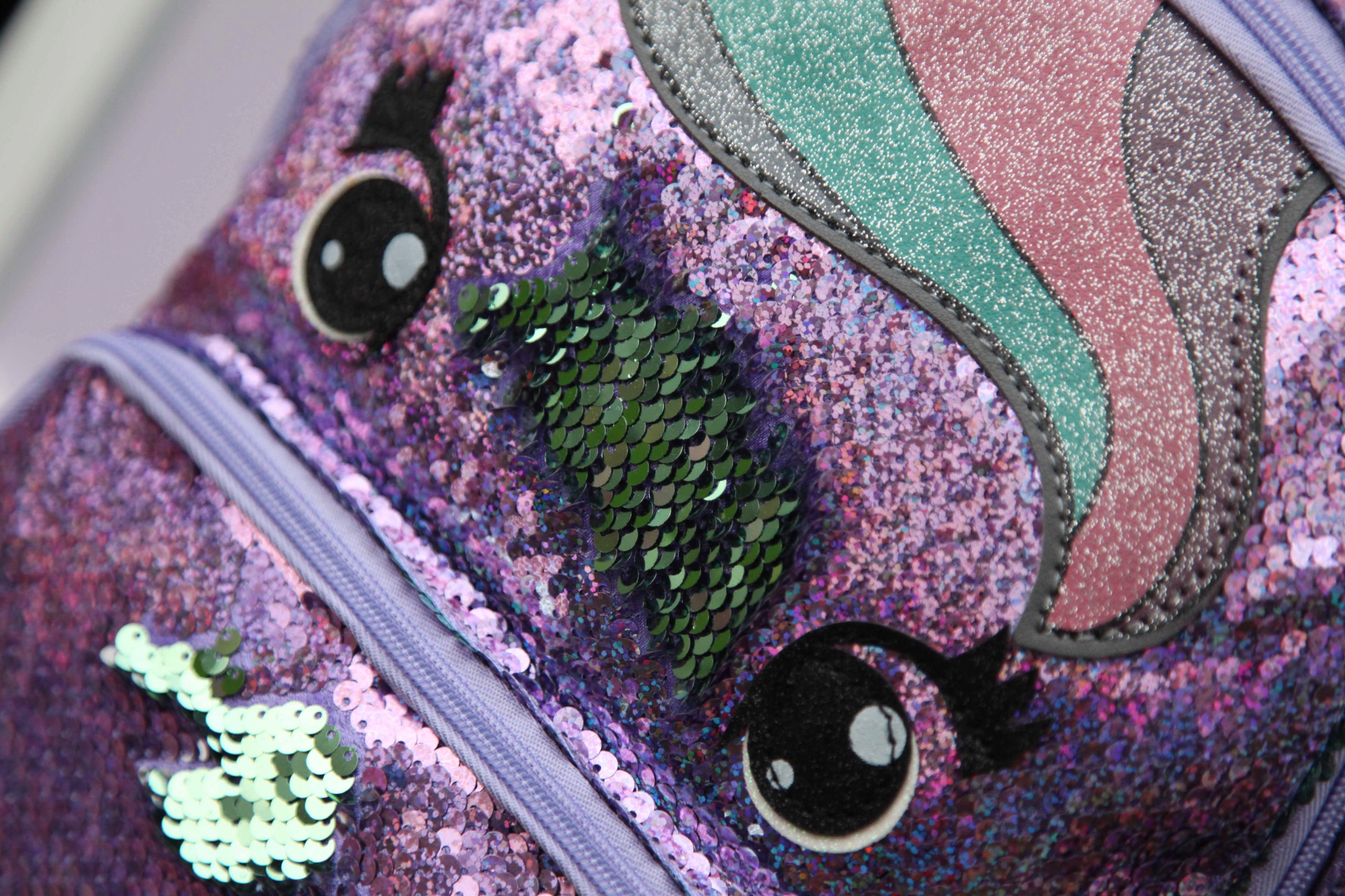 Чудове виготовлення. Красиві чарівні блискітки, що змінюються від фіолетового до бірюзового. Ріг єдинорога виблискує блискучими зірками. Вуха-рюкзак голографічний. Матеріал, що імітує волосся єдинорога і красиво мерехтливі очі. Спинка рюкзака злегка посилена і має широкі зручні регульовані лямки. Всередині рюкзака є кишеня. З боків є 2 практичні кишені, наприклад, для напоїв. Кишеня для перекусів на передній частині рюкзака.