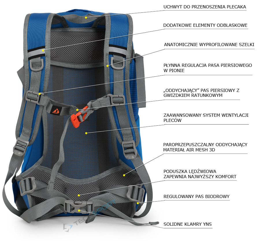 Рюкзак має повітропроникну систему для перенесення на основі металевого каркаса, загнутого всередину, і сітки, натягнутої на спині. Також є зручні подушки, обшиті сіткою AIR-MESH внизу та зверху спинки:
