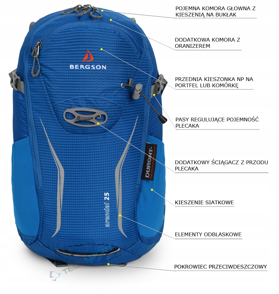 Комфортний рюкзак BERGSON з інноваційним дизайном системи перенесення. Модель Arendal підійде як під час поїздок в гори, так і в якості міського або шкільного рюкзака. Має зручний стегновий ремінь і нагрудний ремінь, який стабілізує рюкзак на плечах за допомогою рятувального свистка, вбудованого в пряжку. Завдяки додатковій кишені всередині рюкзака та спеціальному отвору, він був адаптований для встановлення міхура для води (пропозицію відповідних пляшок з водою можна знайти на інших наших аукціонах). Рюкзак також має можливість кріплення палиць або льодоруба. Завдяки системі перенесення AIR IN-VENT SQ-MESH® з плечовими лямками анатомічної форми «S» рюкзак дуже добре носиться, зручний і ви не будете відчувати втоми навіть після тривалого походу. Дуже міцно зроблений і добре оброблений - кожна деталь вишукана. Виготовлений з матеріалів найвищої якості: Honeycomb Rip-Stop Duront® - дуже міцна, але легка тканина з стільниковою структурою, додатково посилена додаванням додаткового, більш міцного волокна. Завдяки використанню сітки AIR-MESH на плечових лямках і на подушках несучої системи рюкзак забезпечує вільну циркуляцію повітря. Рюкзак характеризується високою стійкістю і дозволяє комфортно використовувати навіть у важких умовах з великими навантаженнями.