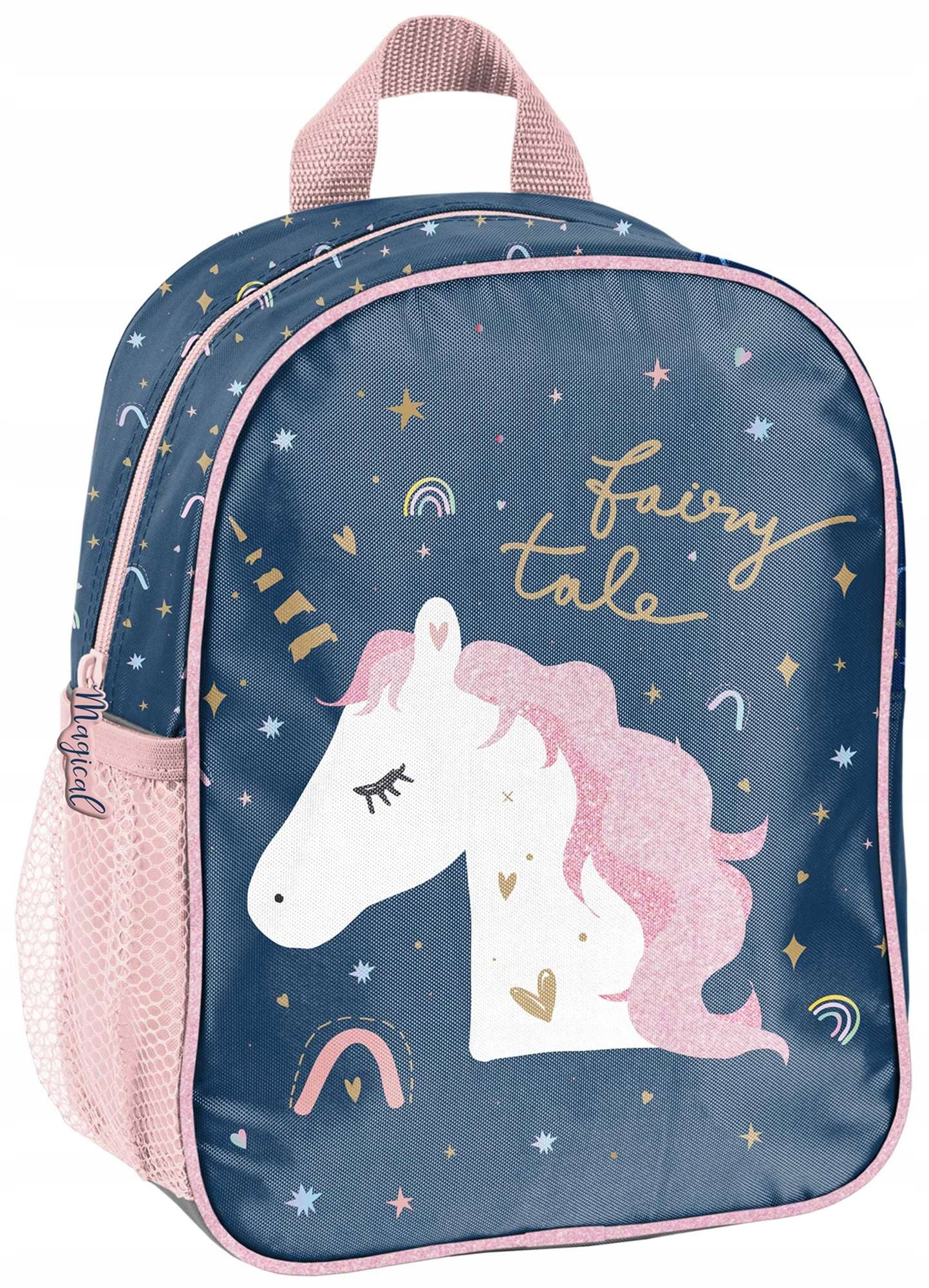Рюкзак у синьому та рожевому кольорах,на ньому зображений єдиноріг та візерунки єдинорога.