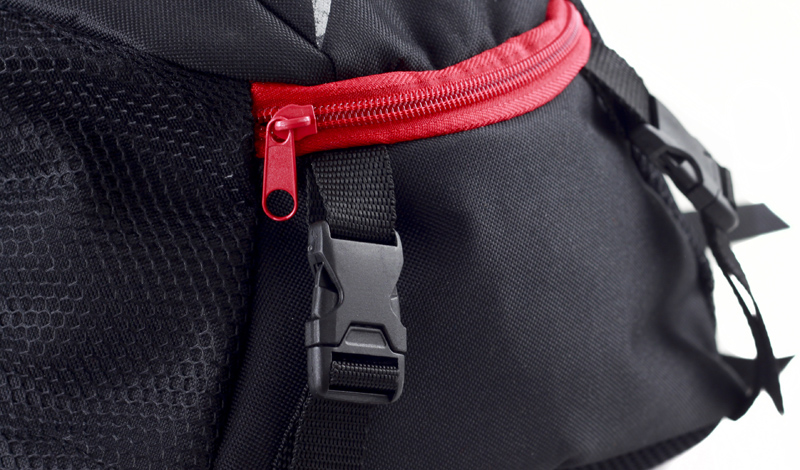 Рюкзак оснащений регульованим нагрудним і стегновим ременем, що застібається на застібки, профільованими плечовими лямками та злегка посиленою спинкою .