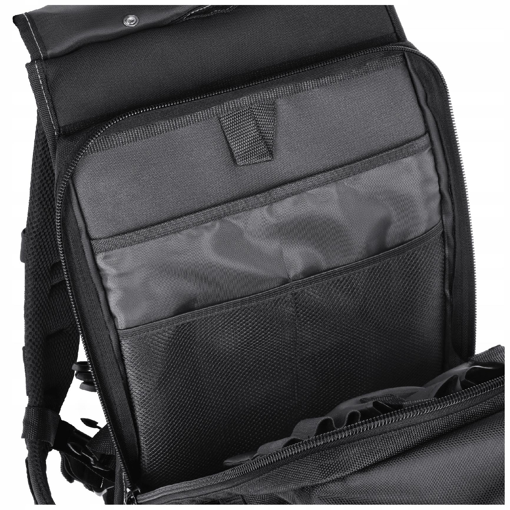 Рюкзак для інструментів "PNP28" - професійний аксесуар, корисний для монтажних і сервісних робіт. Виготовлена з міцної та додатково посиленої поліестерової тканини. Він стійкий до механічних пошкоджень і легко чиститься. Він розділений на 4 зовнішніх кишені, що полегшує розділення необхідних речей. Всередині є додаткова кишеня для ноутбука і 18 менших відділень для зберігання робочих аксесуарів. Рюкзак не тільки функціональний, але і зручний для користувача. У верхній частині розташована міцна ручка для носіння рюкзака в руці. Профільовані ремні ергономічної форми мають точну систему регулювання. На комфорт використання рюкзака впливає додаткова регульована нагрудна лямка і система м'яких дихаючих подушок на спині. Світловідбиваючі елементи забезпечують кращу видимість у сутінках і підвищують безпеку користувача.