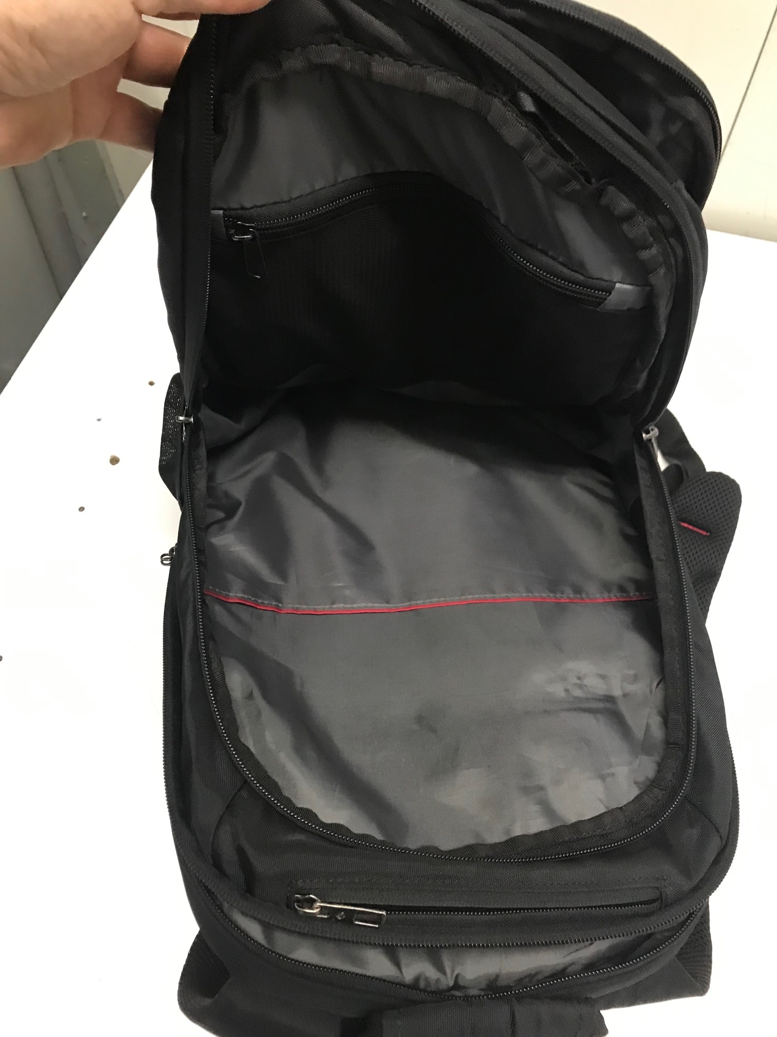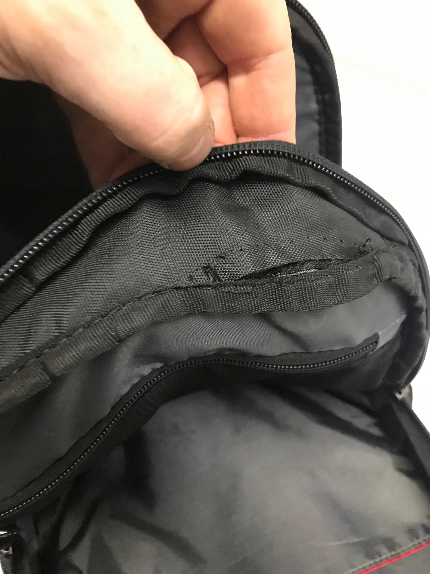 МАЄ ЗАТЯГИ МАТЕРІАЛУ НА ДНІ РЮЗКА ТА СТЕГНІ ШВИ НА ОДНОМУ З ВНУТРІШНІ ВІДДІЛЕННЯ