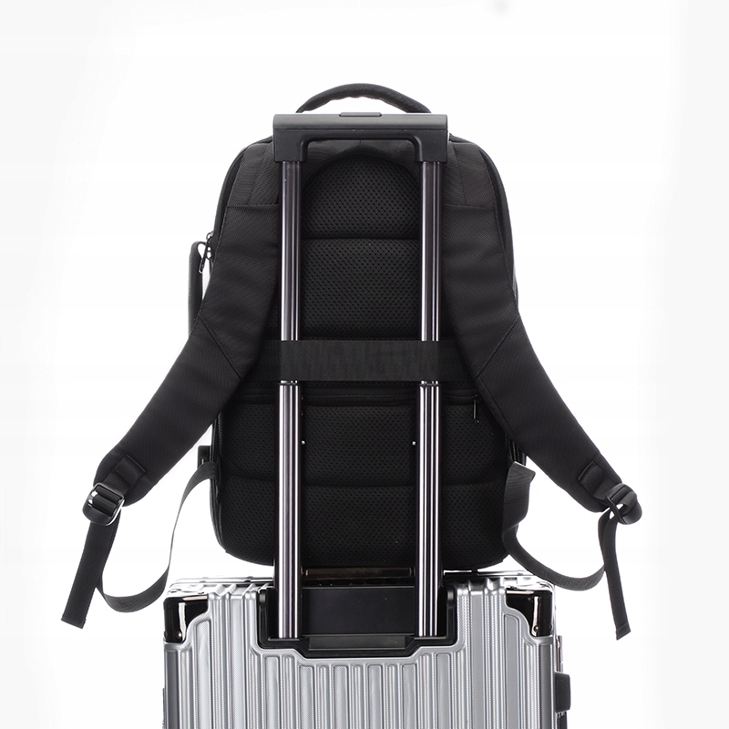 Ззаду, під лямками, є непомітна кишеня на блискавці та ремінь, який дозволяє прикріпити рюкзак до ручки дорожньої сумки