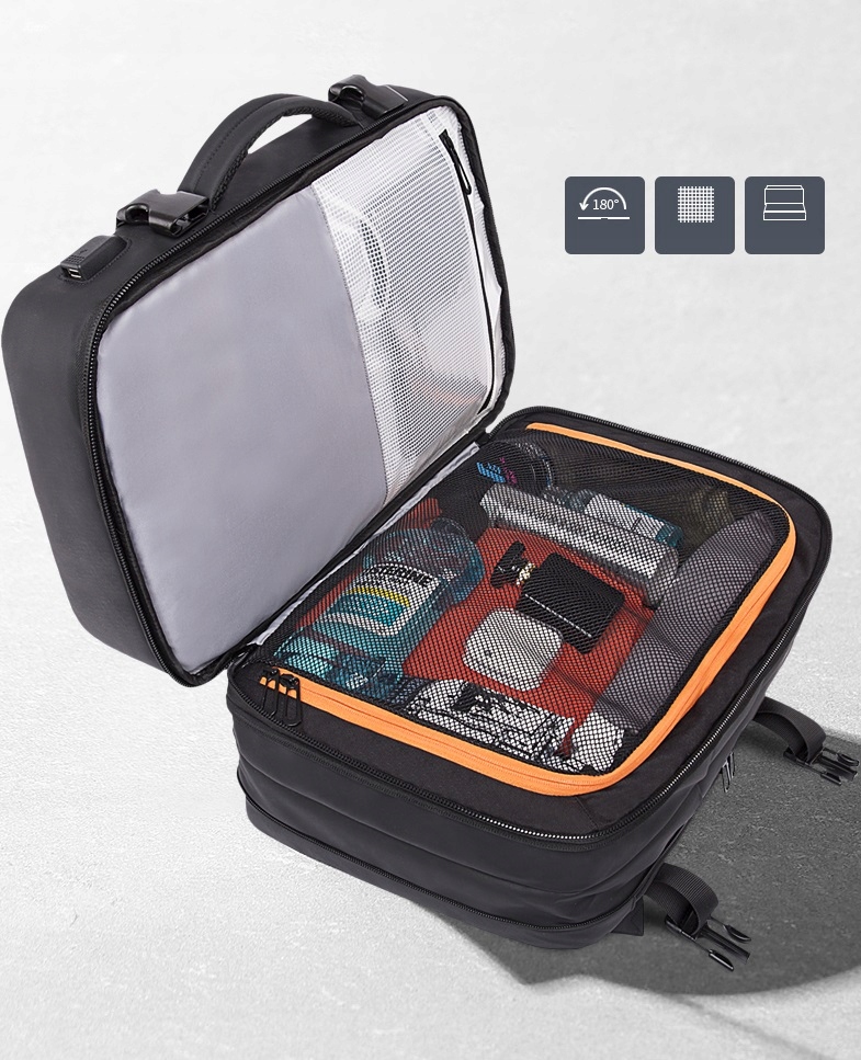 Рюкзак можна відкрити, як валізу. Це полегшує упаковку, а одяг, покладений у відділення, можна легко закріпити за допомогою сітчастого клапана на блискавці. Таким чином, ви не будете боятися, що ваш одяг випаде, коли ви захочете щось дістати з рюкзака.