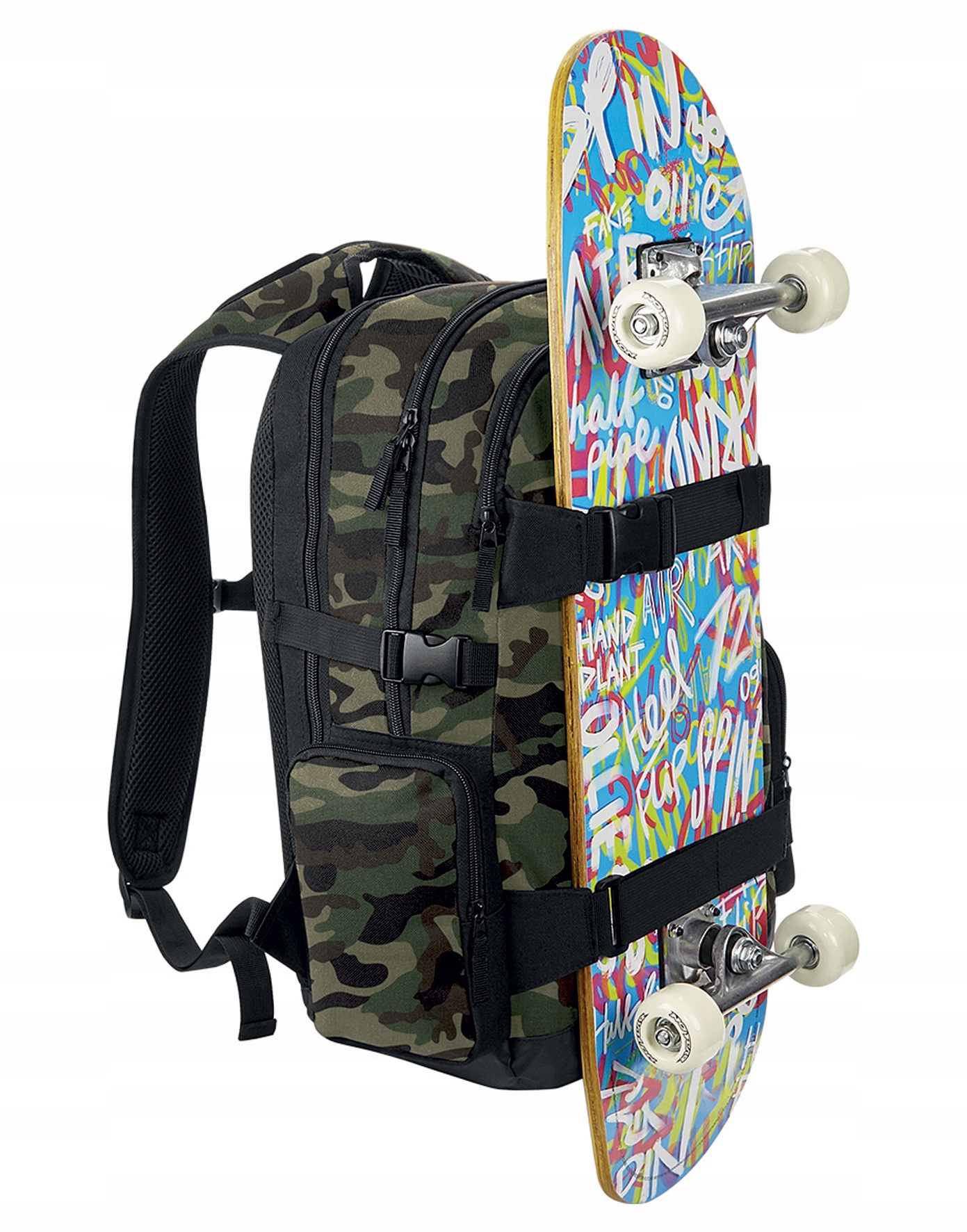Високоякісний рюкзак із місцем для ноутбука (макс. 17 дюймів) і ременями для кріплення, наприклад, скейтборду. Рюкзак має велике основне відділення, що застібається двосторонньою блискавкою, і повністю м’яке відділення для ноутбука, що закривається окремою блискавкою Додаткові бічні кишені та невелика передня кишеня також закриваються на блискавку.