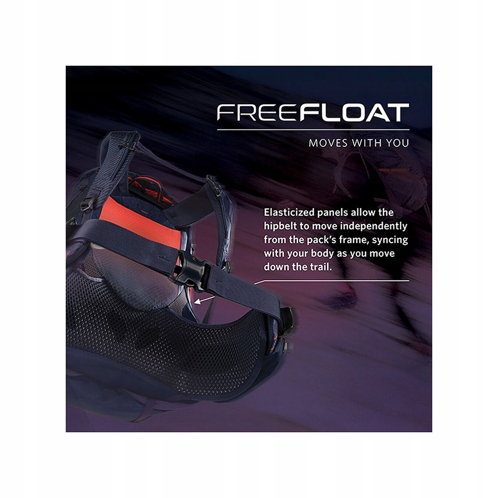Найбільшою перевагою цієї моделі є система перенесення FreeFloat. В основі конструкції лежить каркас і перфорований пінопласт, покритий сіткою. Таке рішення гарантує хороше прилягання рюкзака до спини по всій довжині при збереженні належного рівня відведення вологи. Крім того, ця система пропонує можливість регулювати висоту ременів відносно стегнового ременя. Це робиться шляхом прикріплення панелі, оснащеної міцною липучкою. Це рішення дозволяє ідеально підлаштувати рюкзак під зріст і комплекцію користувача. Він виготовлений з дуже легких і міцних матеріалів: нейлон високої щільності 100D і нейлон високої щільності 210D. Спереду є кишеня з еластичної сітки. З обох боків є просторі сітчасті кишені, які ідеально підходять для транспортування пляшок з водою. Один із них також дозволяє бічний доступ до вмісту. Рюкзак має основне відділення з відділенням для водяного міхура або мокрого одягу (водяний міхур не входить). Основне відділення закривається на клапан і має 2 кишені на блискавці (зовнішній і внутрішній). Додатково у внутрішній кишені є прихований чохол від дощу. Доступ до основного відділення можливий зверху після відстібання клапана і знизу. Плечові лямки вентильовані та покриті перфорованим матеріалом. Плечові ремені також мають ремені для кріплення трубки водяного міхура або для перенесення додаткового обладнання та спеціально розроблену еластичну сітчасту кишеню. Рюкзак має плавно регульовану нагрудну лямку з вбудованим свистком і стегновий ремінь, інтегрований у структуру системи перенесення. Це забезпечує ідеальне прилягання до стегон і правильну передачу навантаження. На поясі є дві кишені на блискавці. Бічні компресійні лямки дозволяють зменшити місткість рюкзака або краще стабілізувати вантаж, що транспортується. Крім того, ця модель дозволяє кріпити трекінгові палиці і оснащена зручною ручкою для перенесення. На клапані є петлі для кріплення додаткового спорядження і два ремені внизу для кріплення, наприклад, спальника.
