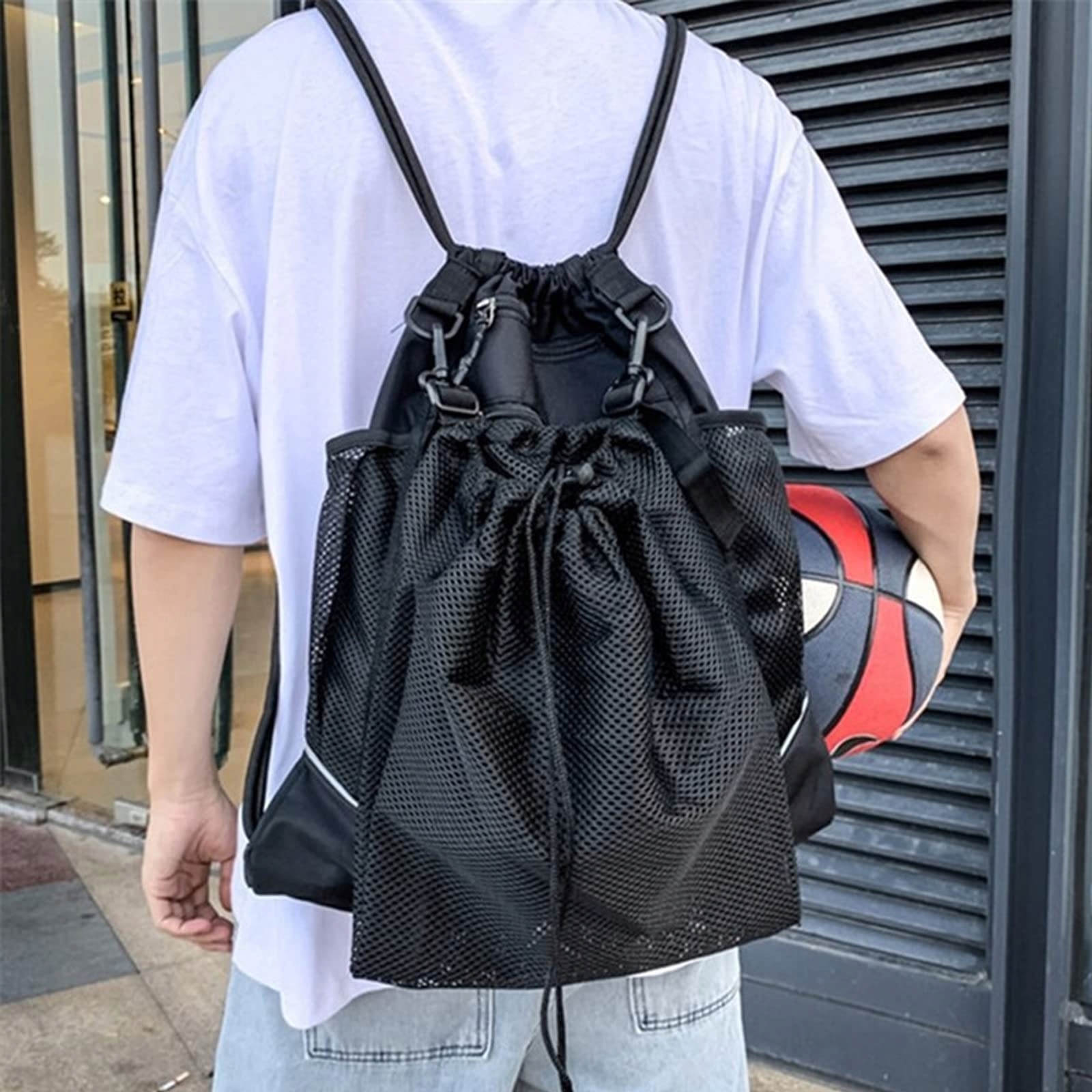 Спортивна сумка з струною має сітчасту сумку з блискавкою на дні, яку можна зняти і закріпити на липучці на вершині футбольної сумки, баскетболу, волейболу, кулі для регбі, бейсбольних шоломів тощо.