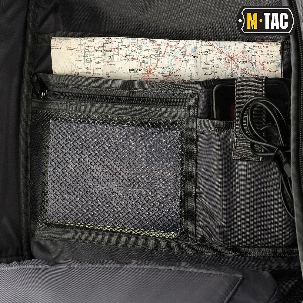 Основна камера відкрилася у великому масштабі, щоб ви могли легко завантажити рюкзак і витягнути з нього речі або поставити всередину. Всередині рюкзак M-TAC захищав відсіки з підкладеними сторонами та стрічкою для кріплення до 15-дюймового ноутбука або планшета, а також кишені з мобільним організатором та супутніми аксесуарами: миша, живлення, джерело живлення, документів, ручок, кабелів тощо.